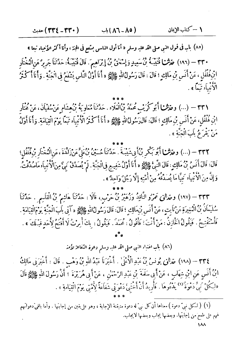330 - (196) حَدَّثَنَا قُتَيْبَةُ بْنُ سَعِيدٍ، وَإِسْحَاقُ بْنُ إِبْرَاهِيمَ، قَالَ قُتَيْبَةُ: حَدَّثَنَا جَرِيرٌ، عَنِ الْمُخْتَارِ بْنِ فُلْفُلٍ، عَنْ أَنَسِ بْنِ مَالِكٍ، قَالَ: قَالَ رَسُولُ اللهِ صَلَّى اللهُ عَلَيْهِ وَسَلَّمَ: «§أَنَا أَوَّلُ النَّاسِ يَشْفَعُ فِي الْجَنَّةِ وَأَنَا أَكْثَرُ الْأَنْبِيَاءِ تَبَعًا»