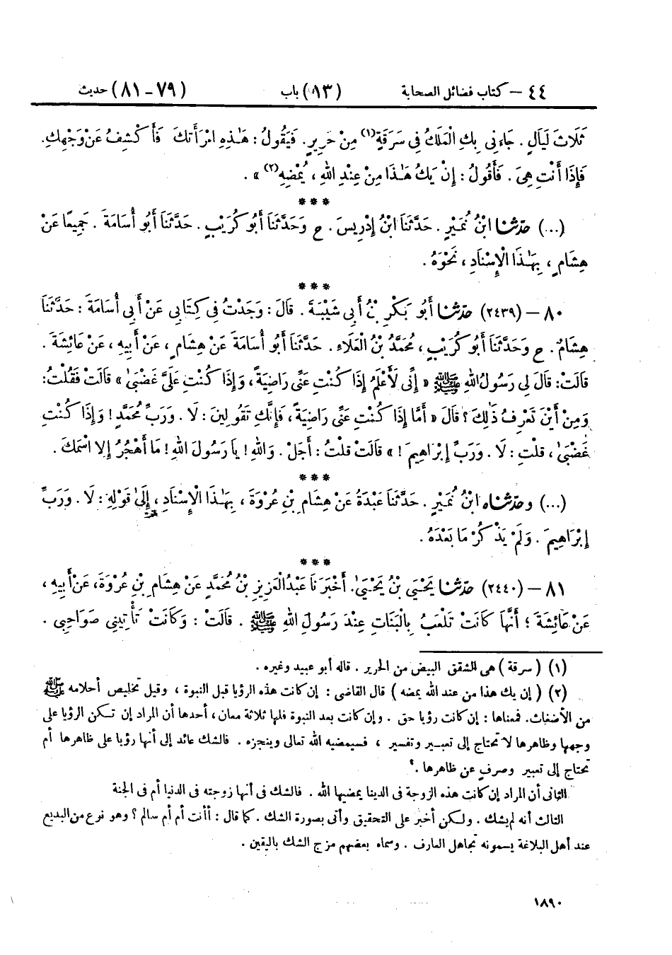 79 - حَدَّثَنَا ابْنُ نُمَيْرٍ، حَدَّثَنَا ابْنُ إِدْرِيسَ، ح وَحَدَّثَنَا أَبُو كُرَيْبٍ، حَدَّثَنَا أَبُو أُسَامَةَ، جَمِيعًا عَنْ هِشَامٍ، بِهَذَا الْإِسْنَادِ، نَحْوَهُ