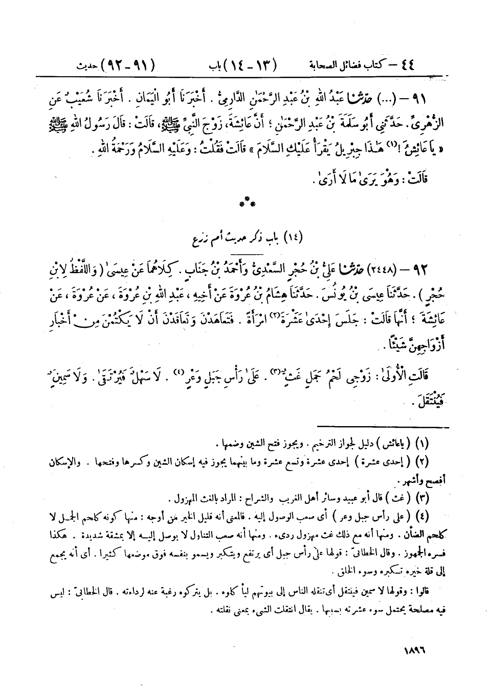 92 - (2448) حَدَّثَنَا عَلِيُّ بْنُ حُجْرٍ السَّعْدِيُّ، وَأَحْمَدُ بْنُ جَنَابٍ، كِلَاهُمَا عَنْ عِيسَى، وَاللَّفْظُ لِابْنِ حُجْرٍ، حَدَّثَنَا عِيسَى بْنُ يُونُسَ، حَدَّثَنَا هِشَامُ بْنُ عُرْوَةَ، عَنْ أَخِيهِ عَبْدِ اللهِ بْنِ عُرْوَةَ، عَنْ عُرْوَةَ، عَنْ عَائِشَةَ، أَنَّهَا قَالَتْ: جَلَسَ إِحْدَى عَشْرَةَ امْرَأَةً، فَتَعَاهَدْنَ وَتَعَاقَدْنَ أَنْ لَا يَكْتُمْنَ مِنْ أَخْبَارِ أَزْوَاجِهِنَّ شَيْئًا. قَالَتِ الْأُولَى: زَوْجِي لَحْمُ جَمَلٍ غَثٍّ، عَلَى رَأْسِ جَبَلٍ لَا سَهْلٌ فَيُرْتَقَى، وَلَا سَمِينٌ فَيُنْتَقَلَ -[1897]-. قَالَتِ الثَّانِيَةُ: زَوْجِي لَا أَبُثُّ خَبَرَهُ، إِنِّي أَخَافُ أَنْ لَا أَذَرَهُ، إِنْ أَذْكُرْهُ أَذْكُرْ عُجَرَهُ وَبُجَرَهُ. قَالَتِ الثَّالِثَةُ: زَوْجِي الْعَشَنَّقُ، إِنْ أَنْطِقْ أُطَلَّقْ، وَإِنْ أَسْكُتْ أُعَلَّقْ. قَالَتِ الرَّابِعَةُ: زَوْجِي كَلَيْلِ تِهَامَةَ لَا حَرَّ وَلَا قُرَّ، وَلَا مَخَافَةَ وَلَا سَآمَةَ. قَالَتِ الْخَامِسَةُ: زَوْجِي إِنْ دَخَلَ فَهِدَ، وَإِنْ خَرَجَ أَسِدَ، وَلَا يَسْأَلُ عَمَّا عَهِدَ. قَالَتِ السَّادِسَةُ: زَوْجِي إِنْ أَكَلَ لَفَّ، وَإِنْ شَرِبَ اشْتَفَّ، وَإِنِ اضْطَجَعَ الْتَفَّ، وَلَا يُولِجُ الْكَفَّ لِيَعْلَمَ الْبَثَّ -[1898]-. قَالَتِ السَّابِعَةُ: زَوْجِي غَيَايَاءُ أَوْ عَيَايَاءُ طَبَاقَاءُ، كُلُّ دَاءٍ لَهُ دَاءٌ، شَجَّكِ أَوْ فَلَّكِ أَوْ جَمَعَ كُلًّا لَكِ. قَالَتِ الثَّامِنَةُ: زَوْجِي الرِّيحُ رِيحُ زَرْنَبٍ، وَالْمَسُّ مَسُّ أَرْنَبٍ. قَالَتِ التَّاسِعَةُ: زَوْجِي رَفِيعُ الْعِمَادِ طَوِيلُ النِّجَادِ عَظِيمُ الرَّمَادِ، قَرِيبُ الْبَيْتِ مِنَ النَّادِ -[1899]-. قَالَتِ الْعَاشِرَةُ: زَوْجِي مَالِكٌ، وَمَا مَالِكٌ؟ مَالِكٌ خَيْرٌ مِنْ ذَلِكَ، لَهُ إِبِلٌ كَثِيرَاتُ الْمَبَارِكِ، قَلِيلَاتُ الْمَسَارِحِ، إِذَا سَمِعْنَ صَوْتَ الْمِزْهَرِ أَيْقَنَّ أَنَّهُنَّ هَوَالِكُ. قَالَتِ الْحَادِيَةَ عَشْرَةَ: زَوْجِي أَبُو زَرْعٍ، فَمَا أَبُو زَرْعٍ؟ أَنَاسَ مِنْ حُلِيٍّ أُذُنَيَّ، وَمَلَأَ مِنْ شَحْمٍ عَضُدَيَّ، وَبَجَّحَنِي فَبَجِحَتْ إِلَيَّ نَفْسِي، وَجَدَنِي فِي أَهْلِ غُنَيْمَةٍ بِشِقٍّ، فَجَعَلَنِي فِي أَهْلِ صَهِيلٍ وَأَطِيطٍ وَدَائِسٍ وَمُنَقٍّ، فَعِنْدَهُ أَقُولُ فَلَا أُقَبَّحُ، وَأَرْقُدُ فَأَتَصَبَّحُ، وَأَشْرَبُ فَأَتَقَنَّحُ -[1900]- أُمُّ أَبِي زَرْعٍ، فَمَا أُمُّ أَبِي زَرْعٍ؟ عُكُومُهَا رَدَاحٌ وَبَيْتُهَا فَسَاحٌ، ابْنُ أَبِي زَرْعٍ، فَمَا ابْنُ أَبِي زَرْعٍ؟، مَضْجَعُهُ كَمَسَلِّ شَطْبَةٍ وَيُشْبِعُهُ ذِرَاعُ الْجَفْرَةِ بِنْتُ أَبِي زَرْعٍ، فَمَا بِنْتُ أَبِي زَرْعٍ؟ طَوْعُ أَبِيهَا وَطَوْعُ أُمِّهَا، وَمِلْءُ كِسَائِهَا وَغَيْظُ جَارَتِهَا، جَارِيَةُ أَبِي زَرْعٍ، فَمَا جَارِيَةُ أَبِي زَرْعٍ؟ لَا تَبُثُّ حَدِيثَنَا تَبْثِيثًا، وَلَا تُنَقِّثُ مِيرَتَنَا تَنْقِيثًا، وَلَا تَمْلَأُ بَيْتَنَا تَعْشِيشًا -[1901]-. قَالَتْ: خَرَجَ أَبُو زَرْعٍ وَالْأَوْطَابُ تُمْخَضُ، فَلَقِيَ امْرَأَةً مَعَهَا وَلَدَانِ لَهَا كَالْفَهْدَيْنِ، يَلْعَبَانِ مِنْ تَحْتِ خَصْرِهَا بِرُمَّانَتَيْنِ فَطَلَّقَنِي وَنَكَحَهَا، فَنَكَحْتُ بَعْدَهُ رَجُلًا سَرِيًّا، رَكِبَ شَرِيًّا، وَأَخَذَ خَطِّيًّا، وَأَرَاحَ عَلَيَّ نَعَمًا ثَرِيًّا، وَأَعْطَانِي مِنْ كُلِّ رَائِحَةٍ زَوْجًا، قَالَ: كُلِي أُمَّ زَرْعٍ وَمِيرِي أَهْلَكِ، فَلَوْ جَمَعْتُ كُلَّ شَيْءٍ أَعْطَانِي مَا بَلَغَ أَصْغَرَ آنِيَةِ أَبِي زَرْعٍ. قَالَتْ عَائِشَةُ: قَالَ لِي رَسُولُ اللهِ صَلَّى اللهُ عَلَيْهِ وَسَلَّمَ: «§كُنْتُ لَكِ كَأَبِي زَرْعٍ لِأُمِّ زَرْعٍ»