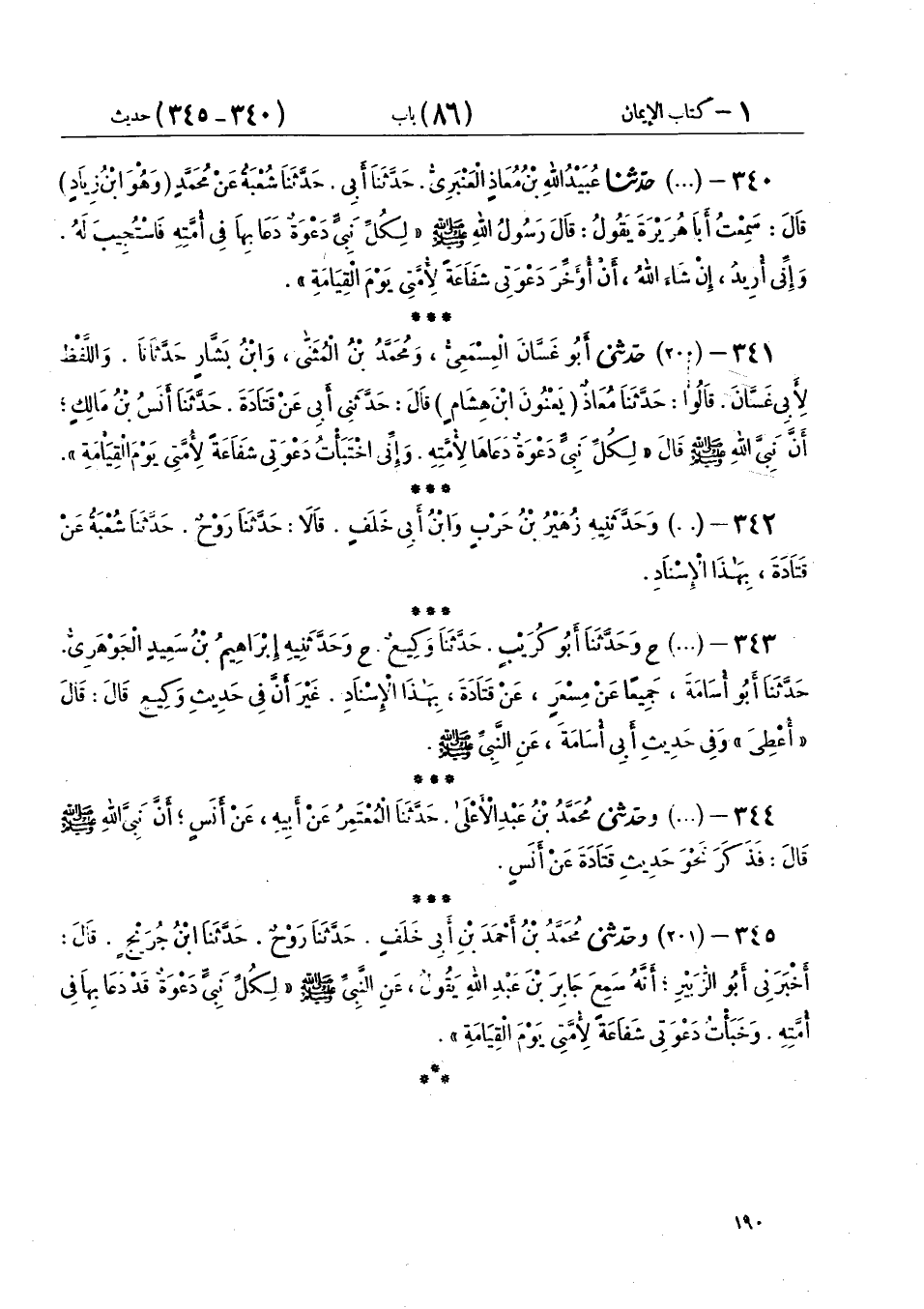 341 - (200) حَدَّثَنِي أَبُو غَسَّانَ الْمِسْمَعِيُّ، وَمُحَمَّدُ بْنُ الْمُثَنَّى، وَابْنُ بَشَّارٍ حَدَّثَانَا، وَاللَّفْظُ لِأَبِي غَسَّانَ، قَالُوا: حَدَّثَنَا مُعَاذٌ يَعْنُونَ ابْنَ هِشَامٍ، قَالَ: حَدَّثَنِي أَبِي، عَنْ قَتَادَةَ، حَدَّثَنَا أَنَسُ بْنُ مَالِكٍ، أَنَّ نَبِيَّ اللهِ صَلَّى اللهُ عَلَيْهِ وَسَلَّمَ قَالَ: «§لِكُلِّ نَبِيٍّ دَعْوَةٌ دَعَاهَا لِأُمَّتِهِ، وَإِنِّي اخْتَبَأْتُ دَعْوَتِي شَفَاعَةً لِأُمَّتِي يَوْمَ الْقِيَامَةِ»،
