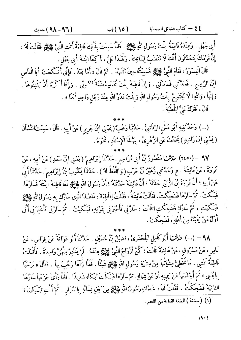 98 - (2450) حَدَّثَنَا أَبُو كَامِلٍ الْجَحْدَرِيُّ فُضَيْلُ بْنُ حُسَيْنٍ، حَدَّثَنَا أَبُو عَوَانَةَ، عَنْ فِرَاسٍ، عَنْ عَامِرٍ، عَنْ مَسْرُوقٍ، عَنْ عَائِشَةَ، قَالَتْ: كُنَّ أَزْوَاجُ النَّبِيِّ صَلَّى اللهُ عَلَيْهِ وَسَلَّمَ عِنْدَهُ، لَمْ يُغَادِرْ مِنْهُنَّ وَاحِدَةً، فَأَقْبَلَتْ فَاطِمَةُ تَمْشِي، مَا تُخْطِئُ مِشْيَتُهَا مِنْ مِشْيَةِ رَسُولِ اللهِ صَلَّى اللهُ عَلَيْهِ وَسَلَّمَ شَيْئًا، فَلَمَّا رَآهَا رَحَّبَ بِهَا، فَقَالَ: «مَرْحَبًا بِابْنَتِي» ثُمَّ أَجْلَسَهَا عَنْ يَمِينِهِ أَوْ عَنْ شِمَالِهِ، ثُمَّ سَارَّهَا فَبَكَتْ بُكَاءً شَدِيدًا، فَلَمَّا رَأَى جَزَعَهَا سَارَّهَا الثَّانِيَةَ فَضَحِكَتْ، فَقُلْتُ لَهَا: خَصَّكِ رَسُولُ اللهِ صَلَّى اللهُ عَلَيْهِ وَسَلَّمَ مِنْ بَيْنِ نِسَائِهِ بِالسِّرَارِ، ثُمَّ أَنْتِ تَبْكِينَ؟ فَلَمَّا قَامَ رَسُولُ اللهِ صَلَّى اللهُ عَلَيْهِ وَسَلَّمَ، سَأَلْتُهَا مَا قَالَ لَكِ رَسُولُ اللهِ صَلَّى اللهُ عَلَيْهِ وَسَلَّمَ؟ قَالَتْ: مَا كُنْتُ أُفْشِي عَلَى رَسُولِ اللهِ صَلَّى اللهُ عَلَيْهِ وَسَلَّمَ سِرَّهُ، قَالَتْ: فَلَمَّا تُوُفِّيَ رَسُولُ اللهِ صَلَّى اللهُ عَلَيْهِ وَسَلَّمَ قُلْتُ: عَزَمْتُ عَلَيْكِ، بِمَا لِي عَلَيْكِ مِنَ الْحَقِّ، لَمَا حَدَّثْتِنِي مَا قَالَ لَكِ رَسُولُ اللهِ صَلَّى اللهُ عَلَيْهِ وَسَلَّمَ، فَقَالَتْ: أَمَّا الْآنَ، فَنَعَمْ، أَمَّا حِينَ سَارَّنِي فِي الْمَرَّةِ الْأُولَى، فَأَخْبَرَنِي أَنَّ جِبْرِيلَ كَانَ يُعَارِضُهُ الْقُرْآنَ فِي كُلِّ سَنَةٍ مَرَّةً أَوْ مَرَّتَيْنِ، وَإِنَّهُ عَارَضَهُ الْآنَ مَرَّتَيْنِ، وَإِنِّي لَا أُرَى الْأَجَلَ إِلَّا قَدِ اقْتَرَبَ، فَاتَّقِي اللهَ وَاصْبِرِي، فَإِنَّهُ نِعْمَ السَّلَفُ أَنَا لَكِ " قَالَتْ: فَبَكَيْتُ بُكَائِي الَّذِي رَأَيْتِ، فَلَمَّا رَأَى جَزَعِي سَارَّنِي الثَّانِيَةَ فَقَالَ: «§يَا فَاطِمَةُ أَمَا تَرْضِيْنَ أَنْ تَكُونِي سَيِّدَةَ نِسَاءِ الْمُؤْمِنِينَ، أَوْ سَيِّدَةَ نِسَاءِ هَذِهِ الْأُمَّةِ» قَالَتْ: فَضَحِكْتُ ضَحِكِي الَّذِي رَأَيْتِ