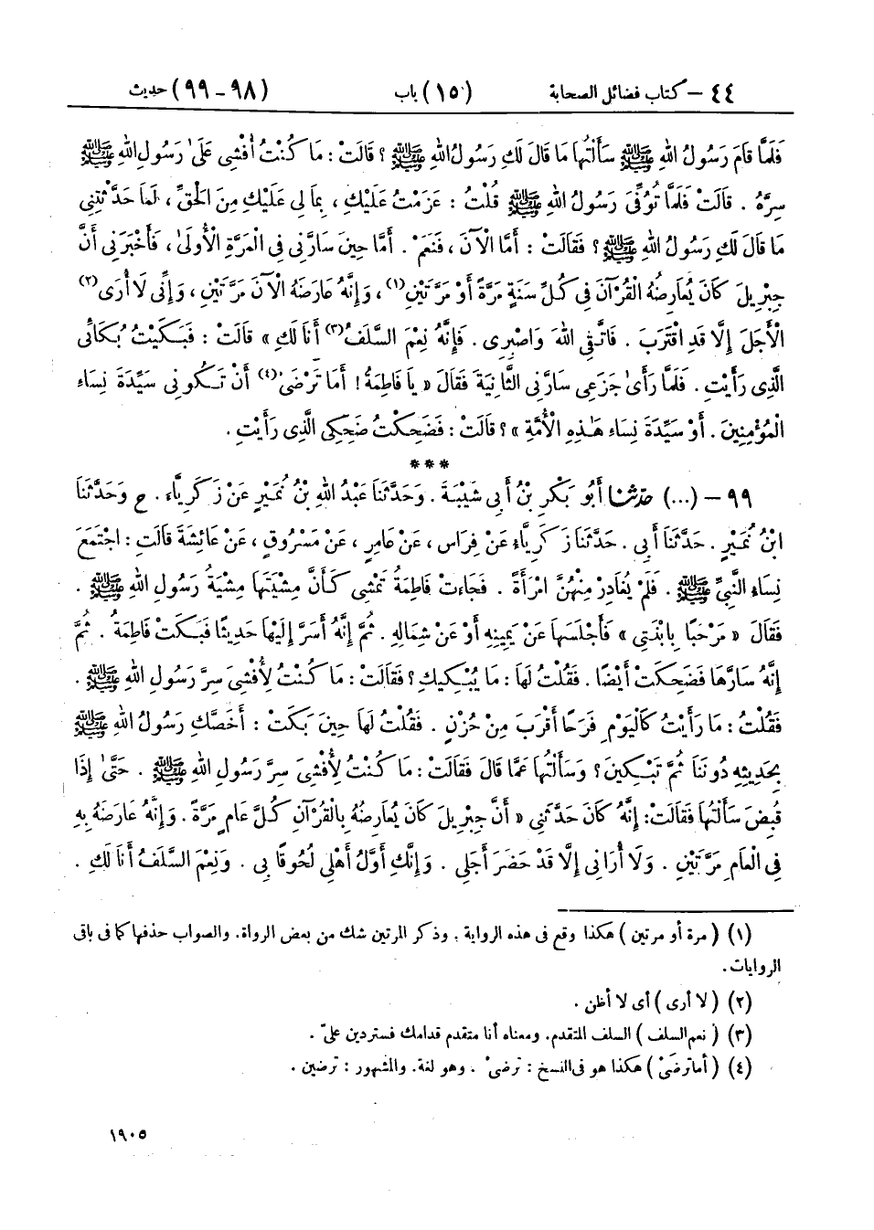 99 - (2450) حَدَّثَنَا أَبُو بَكْرِ بْنُ أَبِي شَيْبَةَ، وَحَدَّثَنَا عَبْدُ اللهِ بْنُ نُمَيْرٍ، عَنْ زَكَرِيَّاءَ، ح وَحَدَّثَنَا ابْنُ نُمَيْرٍ، حَدَّثَنَا أَبِي، حَدَّثَنَا زَكَرِيَّاءُ، عَنْ فِرَاسٍ، عَنْ عَامِرٍ، عَنْ مَسْرُوقٍ، عَنْ عَائِشَةَ، قَالَتْ: اجْتَمَعَ نِسَاءُ النَّبِيِّ صَلَّى اللهُ عَلَيْهِ وَسَلَّمَ، فَلَمْ يُغَادِرْ مِنْهُنَّ امْرَأَةً، فَجَاءَتْ فَاطِمَةُ تَمْشِي كَأَنَّ مِشْيَتَهَا مِشْيَةُ رَسُولِ اللهِ صَلَّى اللهُ عَلَيْهِ وَسَلَّمَ، فَقَالَ: «مَرْحَبًا بِابْنَتِي» فَأَجْلَسَهَا عَنْ يَمِينِهِ أَوْ عَنْ شِمَالِهِ، ثُمَّ إِنَّهُ أَسَرَّ إِلَيْهَا حَدِيثًا فَبَكَتْ فَاطِمَةُ، ثُمَّ إِنَّهُ سَارَّهَا فَضَحِكَتْ أَيْضًا، فَقُلْتُ لَهَا: مَا يُبْكِيكِ؟ فَقَالَتْ: مَا كُنْتُ لِأُفْشِيَ سِرَّ رَسُولِ اللهِ صَلَّى اللهُ عَلَيْهِ وَسَلَّمَ، فَقُلْتُ: مَا رَأَيْتُ كَالْيَوْمِ فَرَحًا أَقْرَبَ مِنْ حُزْنٍ، فَقُلْتُ لَهَا حِينَ بَكَتْ: أَخَصَّكِ رَسُولُ اللهِ صَلَّى اللهُ عَلَيْهِ وَسَلَّمَ بِحَدِيثِهِ دُونَنَا، ثُمَّ تَبْكِينَ؟ وَسَأَلْتُهَا عَمَّا قَالَ فَقَالَتْ: مَا كُنْتُ لِأُفْشِيَ سِرَّ رَسُولِ اللهِ صَلَّى اللهُ عَلَيْهِ وَسَلَّمَ، حَتَّى إِذَا قُبِضَ سَأَلْتُهَا فَقَالَتْ: إِنَّهُ كَانَ حَدَّثَنِي " أَنَّ جِبْرِيلَ كَانَ يُعَارِضُهُ بِالْقُرْآنِ كُلَّ عَامٍ مَرَّةً، وَإِنَّهُ عَارَضَهُ بِهِ فِي الْعَامِ مَرَّتَيْنِ، وَلَا أُرَانِي إِلَّا قَدْ حَضَرَ أَجَلِي، وَإِنَّكِ أَوَّلُ أَهْلِي لُحُوقًا بِي، وَنِعْمَ السَّلَفُ أَنَا لَكِ، فَبَكَيْتُ لِذَلِكَ، ثُمَّ إِنَّهُ سَارَّنِي، فَقَالَ: «§أَلَا تَرْضَيْنَ أَنْ تَكُونِي سَيِّدَةَ نِسَاءِ الْمُؤْمِنِينَ، أَوْ سَيِّدَةَ نِسَاءِ هَذِهِ الْأُمَّةِ» فَضَحِكْتُ لِذَلِكَ