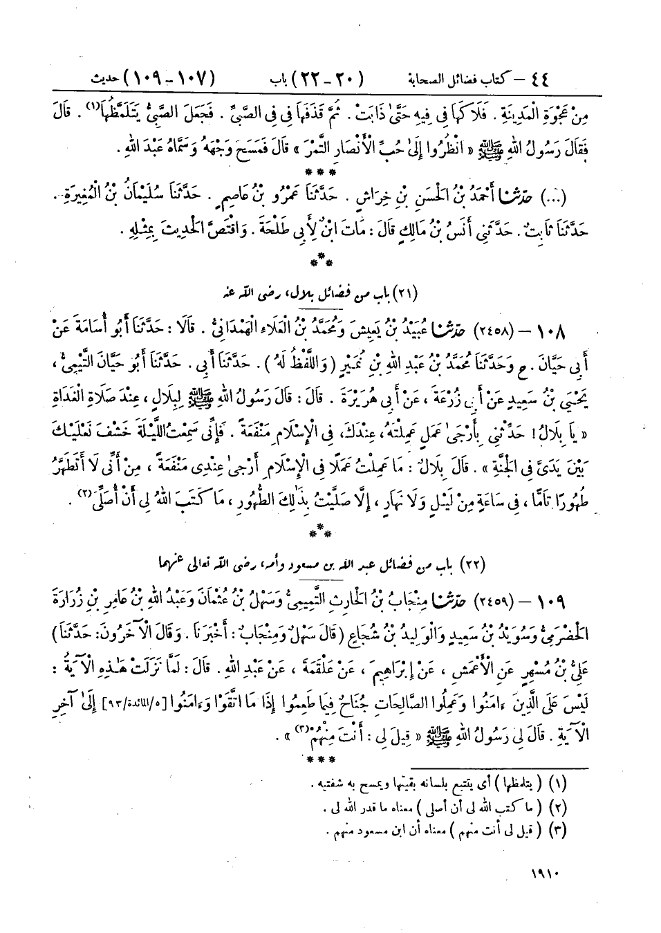 108 - (2458) حَدَّثَنَا عُبَيْدُ بْنُ يَعِيشَ، وَمُحَمَّدُ بْنُ الْعَلَاءِ الْهَمْدَانِيُّ، قَالَا: حَدَّثَنَا أَبُو أُسَامَةَ، عَنْ أَبِي حَيَّانَ، ح وَحَدَّثَنَا مُحَمَّدُ بْنُ عَبْدِ اللهِ بْنِ نُمَيْرٍ، - وَاللَّفْظُ لَهُ - حَدَّثَنَا أَبِي، حَدَّثَنَا أَبُو حَيَّانَ التَّيْمِيُّ يَحْيَى بْنُ سَعِيدٍ، عَنْ أَبِي زُرْعَةَ، عَنْ أَبِي هُرَيْرَةَ، قَالَ: قَالَ رَسُولُ اللهِ صَلَّى اللهُ عَلَيْهِ وَسَلَّمَ لِبِلَالٍ: عِنْدَ صَلَاةِ الْغَدَاةِ «§يَا بِلَالُ حَدِّثْنِي بِأَرْجَى عَمَلٍ عَمِلْتَهُ، عِنْدَكَ فِي الْإِسْلَامِ مَنْفَعَةً، فَإِنِّي سَمِعْتُ اللَّيْلَةَ خَشْفَ نَعْلَيْكَ بَيْنَ يَدَيَّ فِي الْجَنَّةِ» قَالَ بِلَالٌ: مَا عَمِلْتُ عَمَلًا فِي الْإِسْلَامِ أَرْجَى عِنْدِي مَنْفَعَةً، مِنْ أَنِّي لَا أَتَطَهَّرُ طُهُورًا تَامًّا، فِي سَاعَةٍ مِنْ لَيْلٍ وَلَا نَهَارٍ، إِلَّا صَلَّيْتُ بِذَلِكَ الطُّهُورِ، مَا كَتَبَ اللهُ لِي أَنْ أُصَلِّيَ