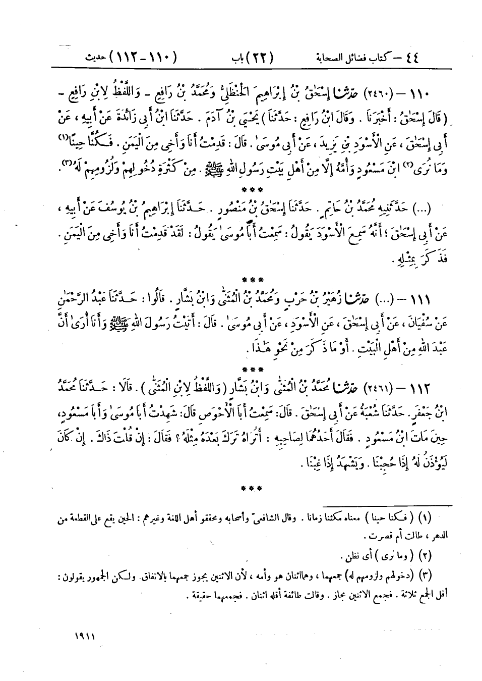 110 - (2460) حَدَّثَنَا إِسْحَاقُ بْنُ إِبْرَاهِيمَ الْحَنْظَلِيُّ، وَمُحَمَّدُ بْنُ رَافِعٍ، - وَاللَّفْظُ لِابْنِ رَافِعٍ قَالَ إِسْحَاقُ: أَخْبَرَنَا، وقَالَ ابْنُ رَافِعٍ: حَدَّثَنَا - يَحْيَى بْنُ آدَمَ، حَدَّثَنَا ابْنُ أَبِي زَائِدَةَ، عَنْ أَبِيهِ، عَنْ أَبِي إِسْحَاقَ، عَنِ الْأَسْوَدِ بْنِ يَزِيدَ، عَنْ أَبِي مُوسَى، قَالَ: قَدِمْتُ أَنَا وَأَخِي مِنَ الْيَمَنِ، فَكُنَّا حِينًا، «وَمَا نُرَى §ابْنَ مَسْعُودٍ، وَأُمَّهُ إِلَّا مِنْ أَهْلِ بَيْتِ رَسُولِ اللهِ صَلَّى اللهُ عَلَيْهِ وَسَلَّمَ، مِنْ كَثْرَةِ دُخُولِهِمْ وَلُزُومِهِمْ لَهُ»