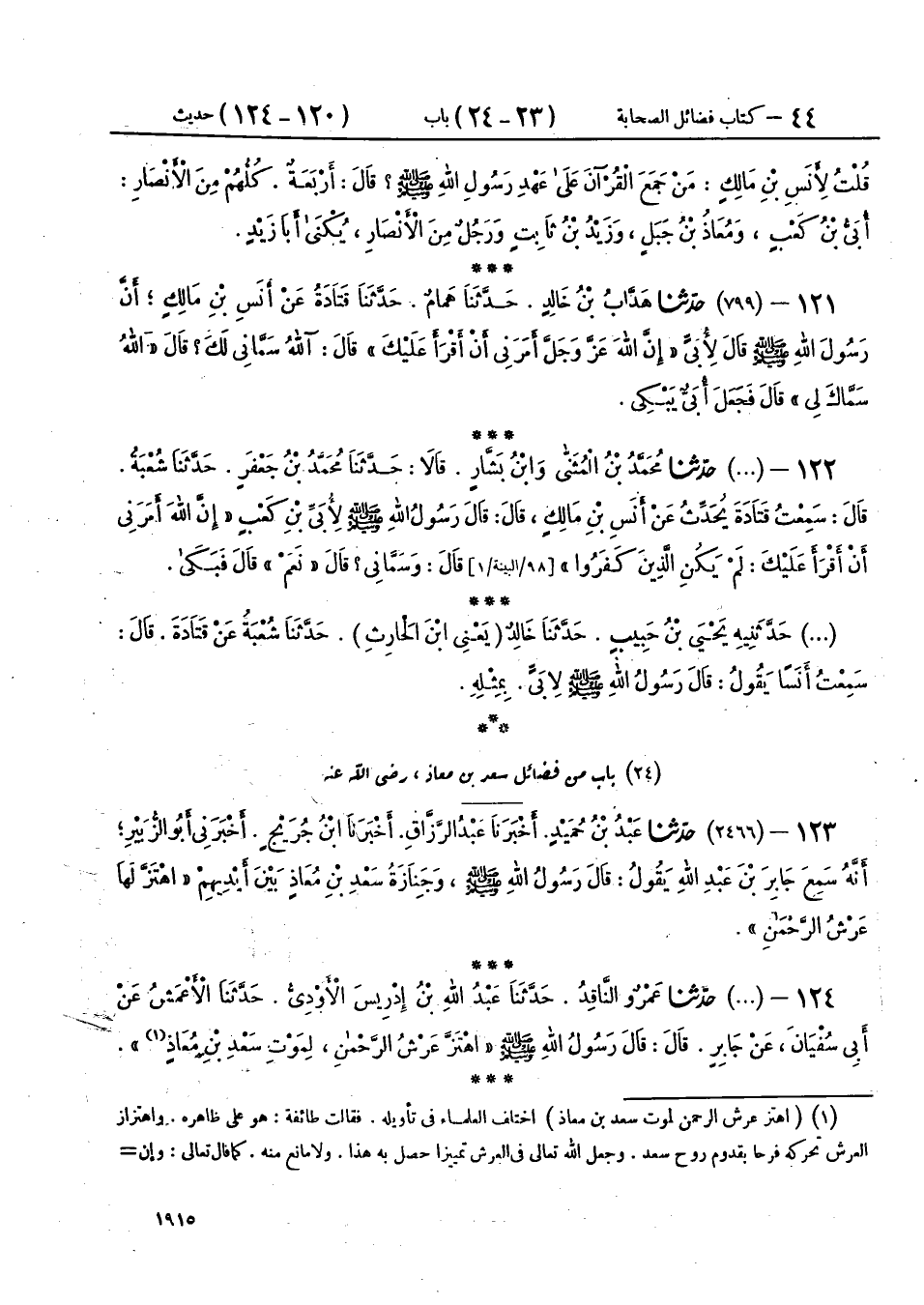 121 - (799) حَدَّثَنَا هَدَّابُ بْنُ خَالِدٍ، حَدَّثَنَا هَمَّامٌ، حَدَّثَنَا قَتَادَةُ، عَنْ أَنَسِ بْنِ مَالِكٍ، أَنَّ رَسُولَ اللهِ صَلَّى اللهُ عَلَيْهِ وَسَلَّمَ، قَالَ لِأُبَيٍّ: «إِنَّ §اللهَ عَزَّ وَجَلَّ أَمَرَنِي أَنْ أَقْرَأَ عَلَيْكَ» قَالَ: آللَّهُ سَمَّانِي لَكَ؟ قَالَ: «اللهُ سَمَّاكَ لِي» قَالَ فَجَعَلَ أُبَيٌّ يَبْكِي