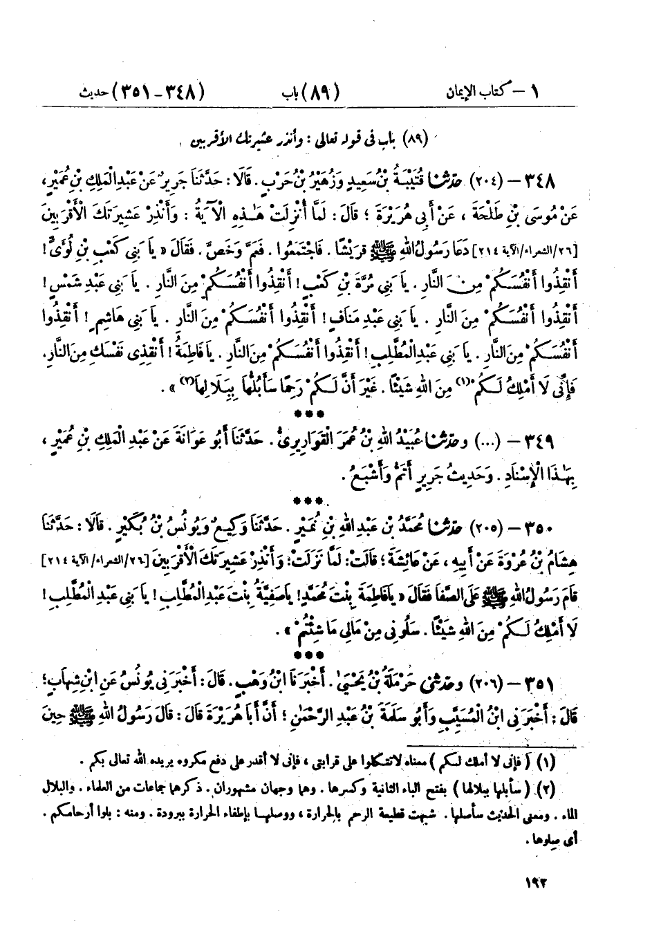 348 - (204) حَدَّثَنَا قُتَيْبَةُ بْنُ سَعِيدٍ، وَزُهَيْرُ بْنُ حَرْبٍ، قَالَا: حَدَّثَنَا جَرِيرٌ، عَنْ عَبْدِ الْمَلِكِ بْنِ عُمَيْرٍ، عَنْ مُوسَى بْنِ طَلْحَةَ، عَنْ أَبِي هُرَيْرَةَ، قَالَ: لَمَّا أُنْزِلَتْ هَذِهِ الْآيَةُ {وَأَنْذِرْ عَشِيرَتَكَ الْأَقْرَبِينَ} [الشعراء: 214]، دَعَا رَسُولُ اللهِ صَلَّى اللهُ عَلَيْهِ وَسَلَّمَ قُرَيْشًا، فَاجْتَمَعُوا فَعَمَّ وَخَصَّ، فَقَالَ: «يَا بَنِي كَعْبِ بْنِ لُؤَيٍّ، §أَنْقِذُوا أَنْفُسَكُمْ مِنَ النَّارِ، يَا بَنِي مُرَّةَ بنِ كَعْبٍ، أَنْقِذُوا أَنْفُسَكُمْ مِنَ النَّارِ، يَا بَنِي عَبْدِ شَمْسٍ، أَنْقِذُوا أَنْفُسَكُمْ مِنَ النَّارِ، يَا بَنِي عَبْدِ مَنَافٍ، أَنْقِذُوا أَنْفُسَكُمْ مِنَ النَّارِ، يَا بَنِي هَاشِمٍ، أَنْقِذُوا أَنْفُسَكُمْ مِنَ النَّارِ، يَا بَنِي عَبْدِ الْمُطَّلِبِ، أَنْقِذُوا أَنْفُسَكُمْ مِنَ النَّارِ، يَا فَاطِمَةُ، أَنْقِذِي نَفْسَكِ مِنَ النَّارِ، فَإِنِّي لَا أَمْلِكُ لَكُمْ مِنَ اللهِ شَيْئًا، غَيْرَ أَنَّ لَكُمْ رَحِمًا سَأَبُلُّهَا بِبَلَالِهَا»،