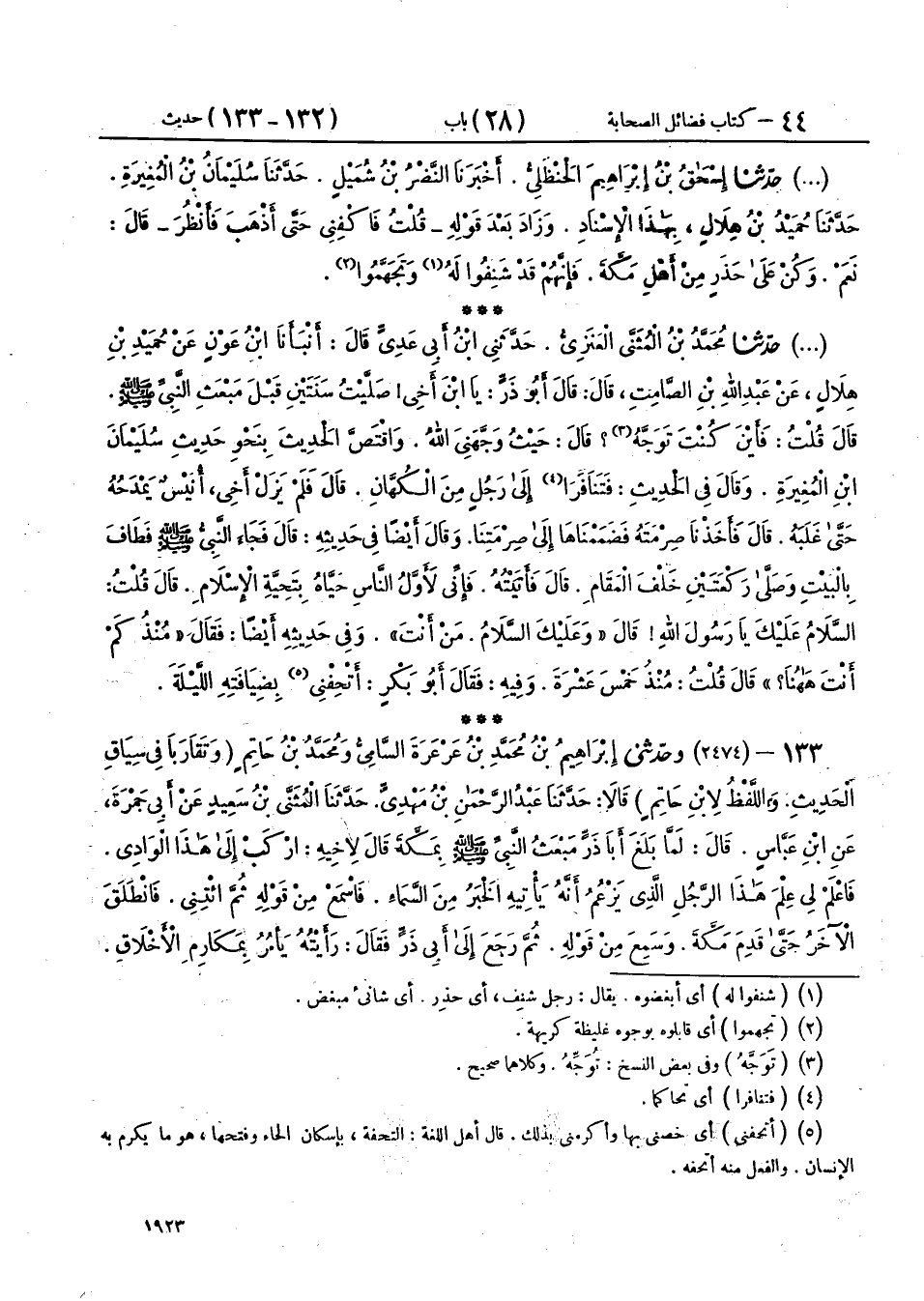 133 - (2474) وحَدَّثَنِي إِبْرَاهِيمُ بْنُ مُحَمَّدِ بْنِ عَرْعَرَةَ السَّامِيُّ، وَمُحَمَّدُ بْنُ حَاتِمٍ - وَتَقَارَبَا فِي سِيَاقِ الْحَدِيثِ، وَاللَّفْظُ لِابْنِ حَاتِمٍ - قَالَا: حَدَّثَنَا عَبْدُ الرَّحْمَنِ بْنُ مَهْدِيٍّ، حَدَّثَنَا الْمُثَنَّى بْنُ سَعِيدٍ، عَنْ أَبِي جَمْرَةَ، عَنِ ابْنِ عَبَّاسٍ، قَالَ: لَمَّا بَلَغَ أَبَا ذَرٍّ مَبْعَثُ النَّبِيِّ صَلَّى اللهُ عَلَيْهِ وَسَلَّمَ بِمَكَّةَ قَالَ لِأَخِيهِ: ارْكَبْ إِلَى هَذَا الْوَادِي، فَاعْلَمْ لِي عِلْمَ هَذَا الرَّجُلِ الَّذِي يَزْعُمُ أَنَّهُ يَأْتِيهِ الْخَبَرُ مِنَ السَّمَاءِ، فَاسْمَعْ مِنْ قَوْلِهِ ثُمَّ ائْتِنِي، فَانْطَلَقَ الْآخَرُ حَتَّى قَدِمَ مَكَّةَ، وَسَمِعَ مِنْ قَوْلِهِ، ثُمَّ رَجَعَ إِلَى أَبِي ذَرٍّ فَقَالَ: رَأَيْتُهُ يَأْمُرُ بِمَكَارِمِ الْأَخْلَاقِ -[1924]-، وَكَلَامًا مَا هُوَ بِالشِّعْرِ، فَقَالَ: مَا شَفَيْتَنِي فِيمَا أَرَدْتُ فَتَزَوَّدَ وَحَمَلَ شَنَّةً لَهُ، فِيهَا مَاءٌ حَتَّى قَدِمَ مَكَّةَ، فَأَتَى الْمَسْجِدَ فَالْتَمَسَ النَّبِيَّ صَلَّى اللهُ عَلَيْهِ وَسَلَّمَ وَلَا يَعْرِفُهُ، وَكَرِهَ أَنْ يَسْأَلَ عَنْهُ، حَتَّى أَدْرَكَهُ - يَعْنِي اللَّيْلَ - فَاضْطَجَعَ، فَرَآهُ عَلِيٌّ فَعَرَفَ أَنَّهُ غَرِيبٌ، فَلَمَّا رَآهُ تَبِعَهُ، فَلَمْ يَسْأَلْ وَاحِدٌ مِنْهُمَا صَاحِبَهُ عَنْ شَيْءٍ، حَتَّى أَصْبَحَ، ثُمَّ احْتَمَلَ قِرْبَتَهُ وَزَادَهُ إِلَى الْمَسْجِدِ، فَظَلَّ ذَلِكَ الْيَوْمَ، وَلَا يَرَى النَّبِيَّ صَلَّى اللهُ عَلَيْهِ وَسَلَّمَ، حَتَّى أَمْسَى، فَعَادَ إِلَى مَضْجَعِهِ، فَمَرَّ بِهِ عَلِيٌّ، فَقَالَ: مَا آنَ لِلرَّجُلِ أَنْ يَعْلَمَ مَنْزِلَهُ؟ فَأَقَامَهُ، فَذَهَبَ بِهِ مَعَهُ، وَلَا يَسْأَلُ وَاحِدٌ مِنْهُمَا صَاحِبَهُ عَنْ شَيْءٍ، حَتَّى إِذَا كَانَ يَوْمُ الثَّالِثِ فَعَلَ مِثْلَ ذَلِكَ، فَأَقَامَهُ عَلِيٌّ مَعَهُ، ثُمَّ قَالَ لَهُ: أَلَا تُحَدِّثُنِي؟ مَا الَّذِي أَقْدَمَكَ هَذَا الْبَلَدَ؟ قَالَ: إِنْ أَعْطَيْتَنِي عَهْدًا وَمِيثَاقًا لَتُرْشِدَنِّي، فَعَلْتُ، فَفَعَلَ. فَأَخْبَرَهُ فَقَالَ: فَإِنَّهُ حَقٌّ وَهُوَ رَسُولُ اللهِ صَلَّى اللهُ عَلَيْهِ وَسَلَّمَ، فَإِذَا أَصْبَحْتَ فَاتَّبِعْنِي، فَإِنِّي إِنْ رَأَيْتُ شَيْئًا أَخَافُ عَلَيْكَ، قُمْتُ كَأَنِّي أُرِيقُ الْمَاءَ، فَإِنْ مَضَيْتُ فَاتَّبِعْنِي حَتَّى تَدْخُلَ مَدْخَلِي، فَفَعَلَ، فَانْطَلَقَ يَقْفُوهُ، حَتَّى دَخَلَ عَلَى النَّبِيِّ صَلَّى اللهُ عَلَيْهِ وَسَلَّمَ وَدَخَلَ مَعَهُ، فَسَمِعَ مِنْ قَوْلِهِ، وَأَسْلَمَ مَكَانَهُ، فَقَالَ لَهُ النَّبِيُّ صَلَّى اللهُ عَلَيْهِ وَسَلَّمَ: «§ارْجِعْ إِلَى قَوْمِكَ فَأَخْبِرْهُمْ حَتَّى يَأْتِيَكَ أَمْرِي» فَقَالَ: وَالَّذِي نَفْسِي بِيَدِهِ لَأَصْرُخَنَّ بِهَا بَيْنَ ظَهْرَانَيْهِمْ فَخَرَجَ حَتَّى أَتَى الْمَسْجِدَ، فَنَادَى بِأَعْلَى صَوْتِهِ: أَشْهَدُ أَنْ لَا إِلَهَ إِلَّا اللهُ، وَأَنَّ مُحَمَّدًا رَسُولُ اللهِ، وَثَارَ الْقَوْمُ فَضَرَبُوهُ حَتَّى أَضْجَعُوهُ، فَأَتَى الْعَبَّاسُ فَأَكَبَّ عَلَيْهِ، فَقَالَ: وَيْلَكُمْ أَلَسْتُمْ تَعْلَمُونَ أَنَّهُ مِنْ غِفَارٍ، وَأَنَّ طَرِيقَ تُجَّارِكُمْ إِلَى الشَّامِ عَلَيْهِمْ، فَأَنْقَذَهُ مِنْهُمْ، ثُمَّ عَادَ مِنَ الْغَدِ بِمِثْلِهَا، وَثَارُوا إِلَيْهِ فَضَرَبُوهُ، فَأَكَبَّ عَلَيْهِ الْعَبَّاسُ فَأَنْقَذَهُ
