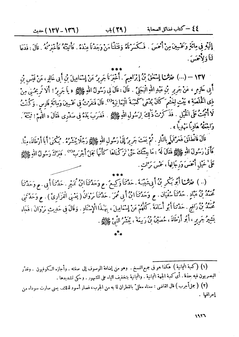 137 - حَدَّثَنَا أَبُو بَكْرِ بْنُ أَبِي شَيْبَةَ، حَدَّثَنَا وَكِيعٌ، ح وَحَدَّثَنَا ابْنُ نُمَيْرٍ، حَدَّثَنَا أَبِي، ح وَحَدَّثَنَا مُحَمَّدُ بْنُ عَبَّادٍ، حَدَّثَنَا سُفْيَانُ، ح وَحَدَّثَنَا ابْنُ أَبِي عُمَرَ، حَدَّثَنَا مَرْوَانُ يَعْنِي الْفَزَارِيَّ، ح وحَدَّثَنِي مُحَمَّدُ بْنُ رَافِعٍ، حَدَّثَنَا أَبُو أُسَامَةَ كُلُّهُمْ، عَنْ إِسْمَاعِيلَ، بِهَذَا الْإِسْنَادِ، وَقَالَ فِي حَدِيثِ مَرْوَانَ: فَجَاءَ بَشِيرُ جَرِيرٍ أَبُو أَرْطَاةَ حُصَيْنُ بْنُ رَبِيعَةَ، يُبَشِّرُ النَّبِيَّ صَلَّى اللهُ عَلَيْهِ وَسَلَّمَ