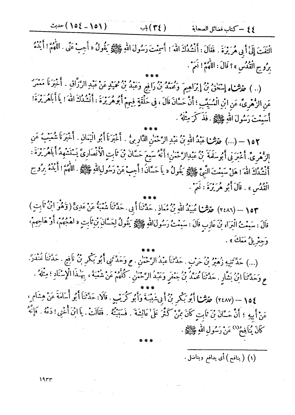 154 - (2487) حَدَّثَنَا أَبُو بَكْرِ بْنُ أَبِي شَيْبَةَ، وَأَبُو كُرَيْبٍ، قَالَا: حَدَّثَنَا أَبُو أُسَامَةَ، عَنْ هِشَامٍ، عَنْ أَبِيهِ، أَنَّ حَسَّانَ بْنَ ثَابِتٍ، كَانَ مِمَّنْ كَثَّرَ عَلَى عَائِشَةَ فَسَبَبْتُهُ فَقَالَتْ: يَا ابْنَ أُخْتِي §دَعْهُ «فَإِنَّهُ كَانَ يُنَافِحُ عَنْ رَسُولِ اللهِ صَلَّى اللهُ عَلَيْهِ وَسَلَّمَ»
