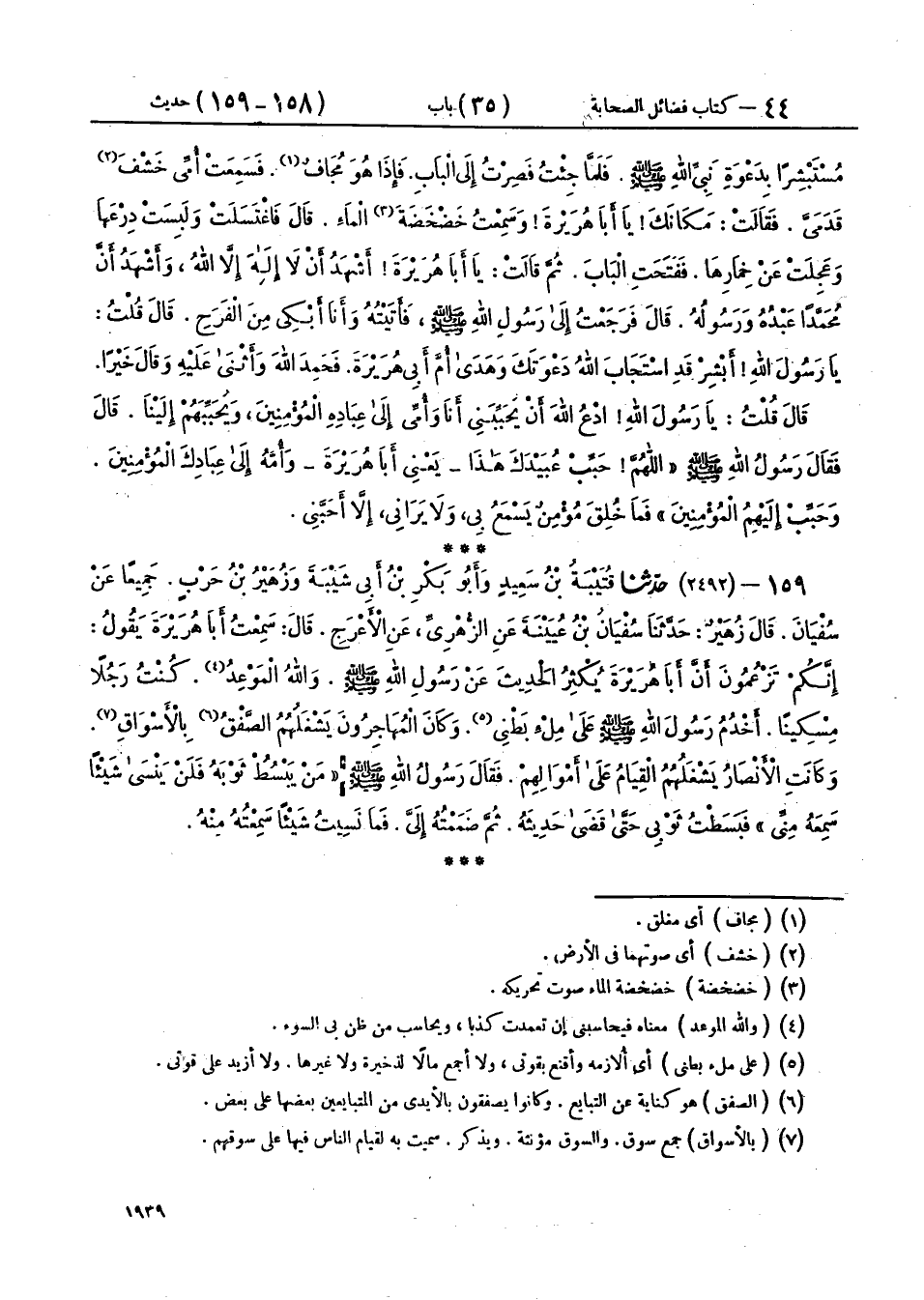 159 - (2492) حَدَّثَنَا قُتَيْبَةُ بْنُ سَعِيدٍ، وَأَبُو بَكْرِ بْنُ أَبِي شَيْبَةَ، وَزُهَيْرُ بْنُ حَرْبٍ، جَمِيعًا عَنْ سُفْيَانَ، قَالَ زُهَيْرٌ: حَدَّثَنَا سُفْيَانُ بْنُ عُيَيْنَةَ، عَنِ الزُّهْرِيِّ، عَنِ الْأَعْرَجِ، قَالَ: سَمِعْتُ أَبَا هُرَيْرَةَ، يَقُولُ: إِنَّكُمْ تَزْعُمُونَ أَنَّ أَبَا هُرَيْرَةَ، يُكْثِرُ الْحَدِيثَ عَنْ رَسُولِ اللهِ صَلَّى اللهُ عَلَيْهِ وَسَلَّمَ، وَاللهُ الْمَوْعِدُ، كُنْتُ رَجُلًا مِسْكِينًا، أَخْدُمُ رَسُولَ اللهِ صَلَّى اللهُ عَلَيْهِ وَسَلَّمَ عَلَى مِلْءِ بَطْنِي، وَكَانَ الْمُهَاجِرُونَ يَشْغَلُهُمُ الصَّفْقُ بِالْأَسْوَاقِ وَكَانَتِ الْأَنْصَارُ يَشْغَلُهُمُ الْقِيَامُ عَلَى أَمْوَالِهِمْ، فَقَالَ رَسُولُ اللهِ صَلَّى اللهُ عَلَيْهِ وَسَلَّمَ: «§مَنْ يَبْسُطْ ثَوْبَهُ فَلَنْ يَنْسَى شَيْئًا سَمِعَهُ مِنِّي» فَبَسَطْتُ ثَوْبِي حَتَّى قَضَى حَدِيثَهُ، ثُمَّ ضَمَمْتُهُ إِلَيَّ، فَمَا نَسِيتُ شَيْئًا سَمِعْتُهُ مِنْهُ