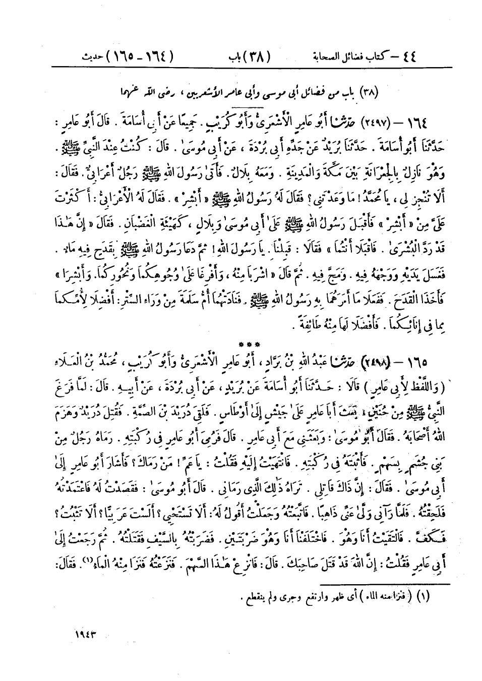 165 - (2498) حَدَّثَنَا عَبْدُ اللهِ بْنُ بَرَّادٍ أَبُو عَامِرٍ الْأَشْعَرِيُّ، وَأَبُو كُرَيْبٍ مُحَمَّدُ بْنُ الْعَلَاءِ، وَاللَّفْظُ لِأَبِي عَامِرٍ، قَالَا: حَدَّثَنَا أَبُو أُسَامَةَ، عَنْ بُرَيْدٍ، عَنْ أَبِي بُرْدَةَ، عَنْ أَبِيهِ، قَالَ: لَمَّا فَرَغَ النَّبِيُّ صَلَّى اللهُ عَلَيْهِ وَسَلَّمَ، مِنْ حُنَيْنٍ، بَعَثَ أَبَا عَامِرٍ عَلَى جَيْشٍ إِلَى أَوْطَاسٍ، فَلَقِيَ دُرَيْدَ بْنَ الصِّمَّةِ، فَقُتِلَ دُرَيْدٌ وَهَزَمَ اللهُ أَصْحَابَهُ، فَقَالَ أَبُو مُوسَى: وَبَعَثَنِي مَعَ أَبِي عَامِرٍ، قَالَ: فَرُمِيَ أَبُو عَامِرٍ فِي رُكْبَتِهِ، رَمَاهُ رَجُلٌ مِنْ بَنِي جُشَمٍ بِسَهْمٍ، فَأَثْبَتَهُ فِي رُكْبَتِهِ فَانْتَهَيْتُ إِلَيْهِ فَقُلْتُ: يَا عَمِّ مَنْ رَمَاكَ؟ فَأَشَارَ أَبُو عَامِرٍ إِلَى أَبِي مُوسَى، فَقَالَ: إِنَّ ذَاكَ قَاتِلِي، تَرَاهُ ذَلِكَ الَّذِي رَمَانِي، قَالَ أَبُو مُوسَى: فَقَصَدْتُ لَهُ فَاعْتَمَدْتُهُ فَلَحِقْتُهُ، فَلَمَّا رَآنِي وَلَّى عَنِّي ذَاهِبًا، فَاتَّبَعْتُهُ وَجَعَلْتُ أَقُولُ لَهُ: أَلَا تَسْتَحْيِي؟ أَلَسْتَ عَرَبِيًّا؟ أَلَا تَثْبُتُ؟ فَكَفَّ، فَالْتَقَيْتُ أَنَا وَهُوَ، فَاخْتَلَفْنَا أَنَا وَهُوَ ضَرْبَتَيْنِ، فَضَرَبْتُهُ بِالسَّيْفِ فَقَتَلْتُهُ، ثُمَّ رَجَعْتُ إِلَى أَبِي عَامِرٍ فَقُلْتُ: إِنَّ اللهَ قَدْ قَتَلَ صَاحِبَكَ، قَالَ: فَانْزِعْ هَذَا السَّهْمَ، فَنَزَعْتُهُ فَنَزَا مِنْهُ الْمَاءُ، فَقَالَ: يَا ابْنَ أَخِي انْطَلِقْ إِلَى رَسُولِ اللهِ صَلَّى اللهُ عَلَيْهِ وَسَلَّمَ فَأَقْرِئْهُ مِنِّي السَّلَامَ، وَقُلْ لَهُ: يَقُولُ لَكَ أَبُو عَامِرٍ: اسْتَغْفِرْ لِي، قَالَ: وَاسْتَعْمَلَنِي أَبُو عَامِرٍ عَلَى النَّاسِ، وَمَكَثَ يَسِيرًا ثُمَّ إِنَّهُ مَاتَ، فَلَمَّا رَجَعْتُ إِلَى النَّبِيِّ صَلَّى اللهُ عَلَيْهِ وَسَلَّمَ دَخَلْتُ عَلَيْهِ، وَهُوَ فِي بَيْتٍ عَلَى سَرِيرٍ مُرْمَلٍ، وَعَلَيْهِ فِرَاشٌ، وَقَدْ أَثَّرَ رِمَالُ السَّرِيرِ بِظَهْرِ رَسُولِ اللهِ صَلَّى اللهُ عَلَيْهِ وَسَلَّمَ وَجَنْبَيْهِ، فَأَخْبَرْتُهُ بِخَبَرِنَا وَخَبَرِ أَبِي عَامِرٍ، وَقُلْتُ لَهُ: قَالَ: قُلْ لَهُ: يَسْتَغْفِرْ لِي، فَدَعَا رَسُولُ اللهِ صَلَّى اللهُ عَلَيْهِ وَسَلَّمَ بِمَاءٍ، فَتَوَضَّأَ مِنْهُ، ثُمَّ رَفَعَ يَدَيْهِ، ثُمَّ قَالَ: «§اللهُمَّ اغْفِرْ لِعُبَيْدٍ أَبِي عَامِرٍ» حَتَّى رَأَيْتُ بَيَاضَ إِبْطَيْهِ، ثُمَّ قَالَ: «اللهُمَّ اجْعَلْهُ يَوْمَ الْقِيَامَةِ فَوْقَ كَثِيرٍ مِنْ خَلْقِكَ، أَوْ مِنَ النَّاسِ» فَقُلْتُ: وَلِي، يَا رَسُولَ اللهِ فَاسْتَغْفِرْ، فَقَالَ النَّبِيُّ صَلَّى اللهُ عَلَيْهِ وَسَلَّمَ: «اللهُمَّ اغْفِرْ لِعَبْدِ اللهِ بْنِ قَيْسٍ ذَنْبَهُ، وَأَدْخِلْهُ يَوْمَ الْقِيَامَةِ مُدْخَلًا كَرِيمًا» قَالَ أَبُو بُرْدَةَ: إِحَدَاهُمَا لِأَبِي عَامِرٍ، وَالْأُخْرَى لِأَبِي مُوسَى