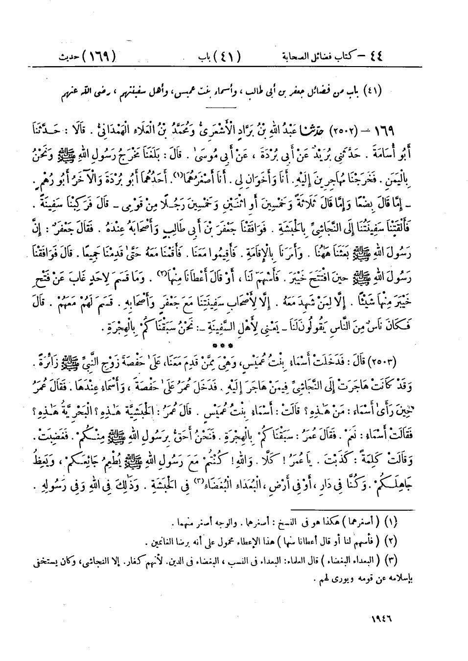 169 - (2502) حَدَّثَنَا عَبْدُ اللهِ بْنُ بَرَّادٍ الْأَشْعَرِيُّ، وَمُحَمَّدُ بْنُ الْعَلَاءِ الْهَمْدَانِيُّ، قَالَا: حَدَّثَنَا أَبُو أُسَامَةَ، حَدَّثَنِي بُرَيْدٌ، عَنْ أَبِي بُرْدَةَ، عَنْ أَبِي مُوسَى، قَالَ: بَلَغَنَا مَخْرَجُ رَسُولِ اللهِ صَلَّى اللهُ عَلَيْهِ وَسَلَّمَ، وَنَحْنُ بِالْيَمَنِ، فَخَرَجْنَا مُهَاجِرِينَ إِلَيْهِ، أَنَا وَأَخَوَانِ لِي، أَنَا أَصْغَرُهُمَا، أَحَدُهُمَا أَبُو بُرْدَةَ وَالْآخَرُ أَبُو رُهْمٍ - إِمَّا قَالَ بِضْعًا وَإِمَّا قَالَ: ثَلَاثَةً وَخَمْسِينَ أَوِ اثْنَيْنِ وَخَمْسِينَ رَجُلًا مِنْ قَوْمِي - قَالَ فَرَكِبْنَا سَفِينَةً، فَأَلْقَتْنَا سَفِينَتُنَا إِلَى النَّجَاشِيِّ بِالْحَبَشَةِ، فَوَافَقْنَا جَعْفَرَ بْنَ أَبِي طَالِبٍ وَأَصْحَابَهُ عِنْدَهُ، فَقَالَ جَعْفَرٌ: إِنَّ رَسُولَ اللهِ صَلَّى اللهُ عَلَيْهِ وَسَلَّمَ بَعَثَنَا هَاهُنَا، وَأَمَرَنَا بِالْإِقَامَةِ فَأَقِيمُوا مَعَنَا، فَأَقَمْنَا مَعَهُ حَتَّى قَدِمْنَا جَمِيعًا، قَالَ: فَوَافَقْنَا رَسُولَ اللهِ صَلَّى اللهُ عَلَيْهِ وَسَلَّمَ حِينَ افْتَتَحَ خَيْبَرَ، فَأَسْهَمَ لَنَا، أَوْ قَالَ أَعْطَانَا مِنْهَا، وَمَا قَسَمَ لِأَحَدٍ غَابَ عَنْ فَتْحِ خَيْبَرَ مِنْهَا شَيْئًا، إِلَّا لِمَنْ شَهِدَ مَعَهُ، إِلَّا لِأَصْحَابِ سَفِينَتِنَا مَعَ جَعْفَرٍ وَأَصْحَابِهِ، قَسَمَ لَهُمْ مَعَهُمْ، قَالَ فَكَانَ نَاسٌ مِنَ النَّاسِ يَقُولُونَ لَنَا - يَعْنِي لِأَهْلِ السَّفِينَةِ -: نَحْنُ سَبَقْنَاكُمْ بِالْهِجْرَةِ.