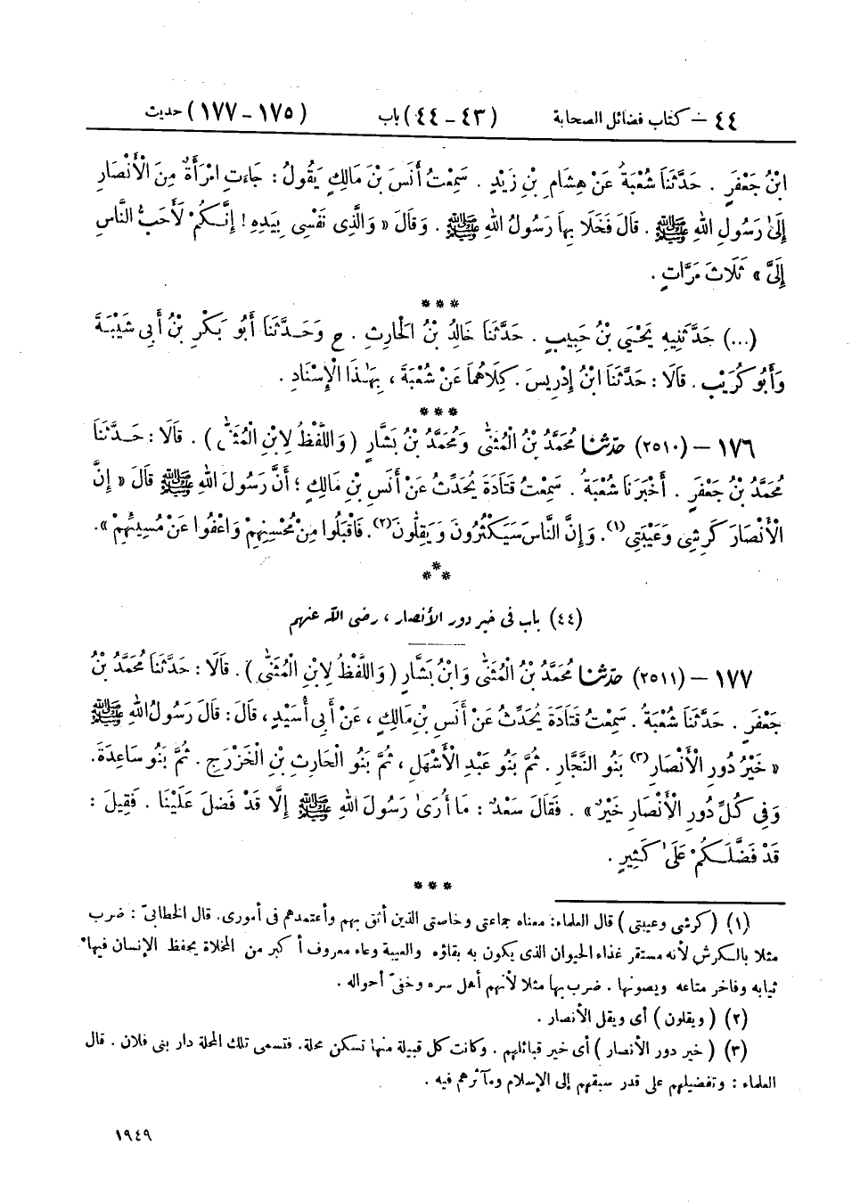177 - (2511) حَدَّثَنَا مُحَمَّدُ بْنُ الْمُثَنَّى، وَابْنُ بَشَّارٍ - وَاللَّفْظُ لِابْنِ الْمُثَنَّى قَالَا: حَدَّثَنَا مُحَمَّدُ بْنُ جَعْفَرٍ، حَدَّثَنَا شُعْبَةُ، سَمِعْتُ قَتَادَةَ، يُحَدِّثُ عَنْ أَنَسِ بْنِ مَالِكٍ، عَنْ أَبِي أُسَيْدٍ، قَالَ: قَالَ رَسُولُ اللهِ صَلَّى اللهُ عَلَيْهِ وَسَلَّمَ: «§خَيْرُ دُورِ الْأَنْصَارِ بَنُو النَّجَّارِ، ثُمَّ بَنُو عَبْدِ الْأَشْهَلِ، ثُمَّ بَنُو الْحَارِثِ بْنِ الْخَزْرَجِ، ثُمَّ بَنُو سَاعِدَةَ وَفِي كُلِّ دُورِ الْأَنْصَارِ خَيْرٌ» فَقَالَ سَعْدٌ: مَا أَرَى رَسُولَ اللهِ صَلَّى اللهُ عَلَيْهِ وَسَلَّمَ إِلَّا قَدْ فَضَّلَ عَلَيْنَا، فَقِيلَ: قَدْ فَضَّلَكُمْ عَلَى كَثِيرٍ