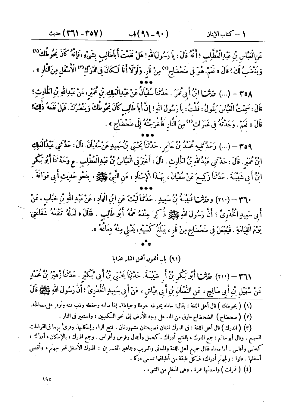358 - (209) حَدَّثَنَا ابْنُ أَبِي عُمَرَ، حَدَّثَنَا سُفْيَانُ، عَنْ عَبْدِ الْمَلِكِ بْنِ عُمَيْرٍ، عَنْ عَبْدِ اللهِ بْنِ الْحَارِثِ، قَالَ: سَمِعْتُ الْعَبَّاسَ، يَقُولُ: قُلْتُ: يَا رَسُولَ اللهِ، إِنَّ أَبَا طَالِبٍ كَانَ يَحُوطُكَ وَيَنْصُرُكَ فَهَلْ نَفَعَهُ ذَلِكَ؟ قَالَ: «نَعَمْ، §وَجَدْتُهُ فِي غَمَرَاتٍ مِنَ النَّارِ، فَأَخْرَجْتُهُ إِلَى ضَحْضَاحٍ».