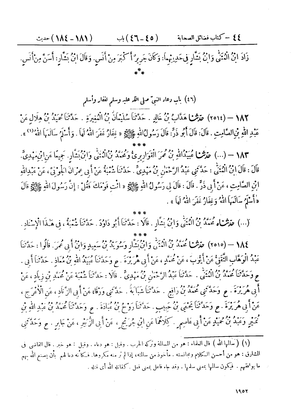 184 - (2515) حَدَّثَنَا مُحَمَّدُ بْنُ الْمُثَنَّى، وَابْنُ بَشَّارٍ وَسُوَيْدُ بْنُ سَعِيدٍ، وَابْنُ أَبِي عُمَرَ، قَالُوا: حَدَّثَنَا عَبْدُ الْوَهَّابِ الثَّقَفِيُّ، عَنْ أَيُّوبَ، عَنْ مُحَمَّدٍ، عَنْ أَبِي هُرَيْرَةَ، ح وَحَدَّثَنَا عُبَيْدُ اللهِ بْنُ مُعَاذٍ، حَدَّثَنَا أَبِي، ح وَحَدَّثَنَا مُحَمَّدُ بْنُ الْمُثَنَّى، حَدَّثَنَا عَبْدُ الرَّحْمَنِ بْنُ مَهْدِيٍّ، قَالَا: حَدَّثَنَا شُعْبَةُ، عَنْ مُحَمَّدِ بْنِ زِيَادٍ، عَنْ أَبِي هُرَيْرَةَ، ح وحَدَّثَنِي مُحَمَّدُ بْنُ رَافِعٍ، حَدَّثَنَا شَبَابَةُ، حَدَّثَنِي وَرْقَاءُ، عَنْ أَبِي الزِّنَادِ، عَنِ الْأَعْرَجِ، عَنْ أَبِي هُرَيْرَةَ، ح وَحَدَّثَنَا يَحْيَى بْنُ حَبِيبٍ، حَدَّثَنَا رَوْحُ بْنُ عُبَادَةَ، ح وَحَدَّثَنَا مُحَمَّدُ بْنُ عَبْدِ اللهِ بْنِ نُمَيْرٍ، وَعَبْدُ بْنُ حُمَيْدٍ، عَنْ أَبِي عَاصِمٍ، كِلَاهُمَا عَنِ ابْنِ جُرَيْجٍ، عَنْ أَبِي الزُّبَيْرِ، عَنْ جَابِرٍ، ح وحَدَّثَنِي سَلَمَةُ بْنُ شَبِيبٍ، حَدَّثَنَا الْحَسَنُ بْنُ أَعْيَنَ، حَدَّثَنَا مَعْقِلٌ، عَنْ أَبِي الزُّبَيْرِ، عَنْ جَابِرٍ، كُلُّهُمْ قَالَ عَنِ النَّبِيِّ صَلَّى اللهُ عَلَيْهِ وَسَلَّمَ قَالَ: «§أَسْلَمُ سَالَمَهَا اللهُ، وَغِفَارُ غَفَرَ اللهُ لَهَا»