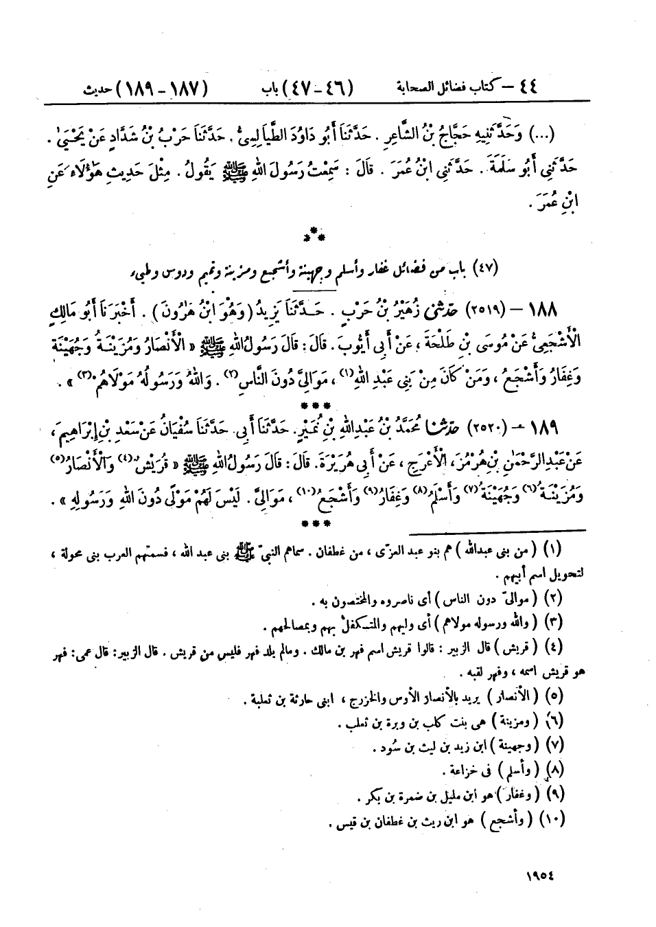 188 - (2519) حَدَّثَنِي زُهَيْرُ بْنُ حَرْبٍ، حَدَّثَنَا يَزِيدُ وَهُوَ ابْنُ هَارُونَ، أَخْبَرَنَا أَبُو مَالِكٍ الْأَشْجَعِيُّ، عَنْ مُوسَى بْنِ طَلْحَةَ، عَنْ أَبِي أَيُّوبَ، قَالَ: قَالَ رَسُولُ اللهِ صَلَّى اللهُ عَلَيْهِ وَسَلَّمَ: «§الْأَنْصَارُ، وَمُزَيْنَةُ، وَجُهَيْنَةُ، وَغِفَارُ، وَأَشْجَعُ، وَمَنْ كَانَ مِنْ بَنِي عَبْدِ اللهِ، مَوَالِيَّ دُونَ النَّاسِ، وَاللهُ وَرَسُولُهُ مَوْلَاهُمْ»