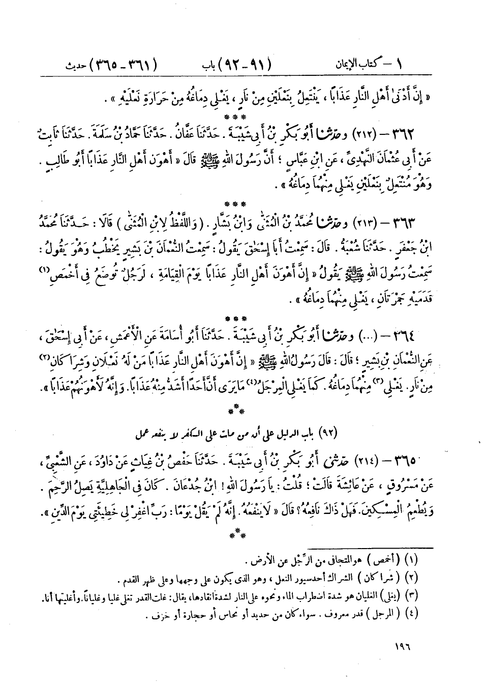 364 - (213) وَحَدَّثَنَا أَبُو بَكْرِ بْنُ أَبِي شَيْبَةَ، حَدَّثَنَا أَبُو أُسَامَةَ، عَنِ الْأَعْمَشِ، عَنْ أَبِي إِسْحَاقَ، عَنِ النُّعْمَانِ بْنِ بَشِيرٍ، قَالَ: قَالَ رَسُولُ اللهِ صَلَّى اللهُ عَلَيْهِ وَسَلَّمَ: «إِنَّ §أَهْوَنَ أَهْلِ النَّارِ عَذَابًا مَنْ لَهُ نَعْلَانِ وَشِرَاكَانِ مِنْ نَارٍ، يَغْلِي مِنْهُمَا دِمَاغُهُ كَمَا يَغْلِ الْمِرْجَلُ، مَا يَرَى أَنَّ أَحَدًا أَشَدُّ مِنْهُ عَذَابًا وَإِنَّهُ لَأَهْوَنُهُمْ عَذَابًا»