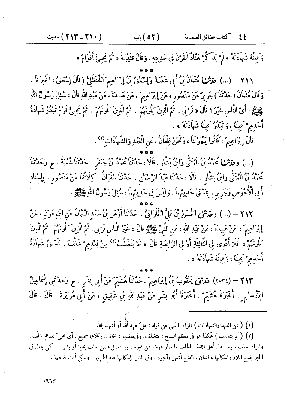 211 - (2533) حَدَّثَنَا عُثْمَانُ بْنُ أَبِي شَيْبَةَ، وَإِسْحَاقُ بْنُ إِبْرَاهِيمَ الْحَنْظَلِيُّ، - قَالَ إِسْحَاقُ: أَخْبَرَنَا وقَالَ عُثْمَانُ: حَدَّثَنَا - جَرِيرٌ، عَنْ مَنْصُورٍ، عَنْ إِبْرَاهِيمَ، عَنْ عَبِيدَةَ، عَنْ عَبْدِ اللهِ، قَالَ: سُئِلَ رَسُولُ اللهِ صَلَّى اللهُ عَلَيْهِ وَسَلَّمَ: §أَيُّ النَّاسِ خَيْرٌ؟ قَالَ: «قَرْنِي، ثُمَّ الَّذِينَ يَلُونَهُمْ، ثُمَّ الَّذِينَ يَلُونَهُمْ، ثُمَّ يَجِيءُ قَوْمٌ تَبْدُرُ شَهَادَةُ أَحَدِهِمْ يَمِينَهُ، وَتَبْدُرُ يَمِينُهُ شَهَادَتَهُ» قَالَ إِبْرَاهِيمُ: كَانُوا يَنْهَوْنَنَا، وَنَحْنُ غِلْمَانٌ، عَنِ الْعَهْدِ وَالشَّهَادَاتِ
