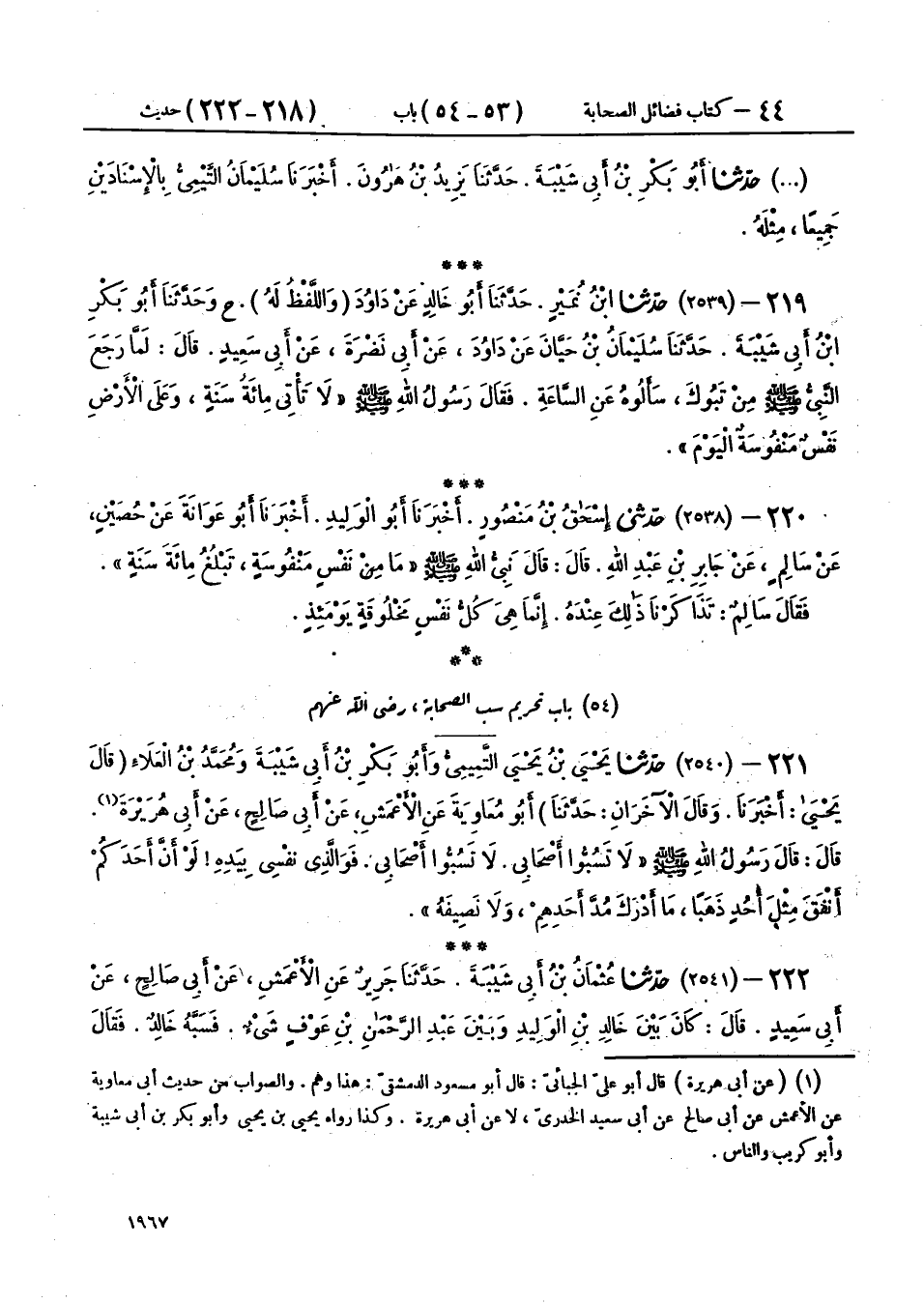 221 - (2540) حَدَّثَنَا يَحْيَى بْنُ يَحْيَى التَّمِيمِيُّ، وَأَبُو بَكْرِ بْنُ أَبِي شَيْبَةَ، وَمُحَمَّدُ بْنُ الْعَلَاءِ - قَالَ يَحْيَى: أَخْبَرَنَا، وقَالَ الْآخَرَانِ: حَدَّثَنَا - أَبُو مُعَاوِيَةَ، عَنِ الْأَعْمَشِ، عَنْ أَبِي صَالِحٍ، عَنْ أَبِي هُرَيْرَةَ، قَالَ: قَالَ رَسُولُ اللهِ صَلَّى اللهُ عَلَيْهِ وَسَلَّمَ: «§لَا تَسُبُّوا أَصْحَابِي، لَا تَسُبُّوا أَصْحَابِي، فَوَالَّذِي نَفْسِي بِيَدِهِ لَوْ أَنَّ أَحَدَكُمْ أَنْفَقَ مِثْلَ أُحُدٍ ذَهَبًا، مَا أَدْرَكَ مُدَّ أَحَدِهِمْ، وَلَا نَصِيفَهُ»
