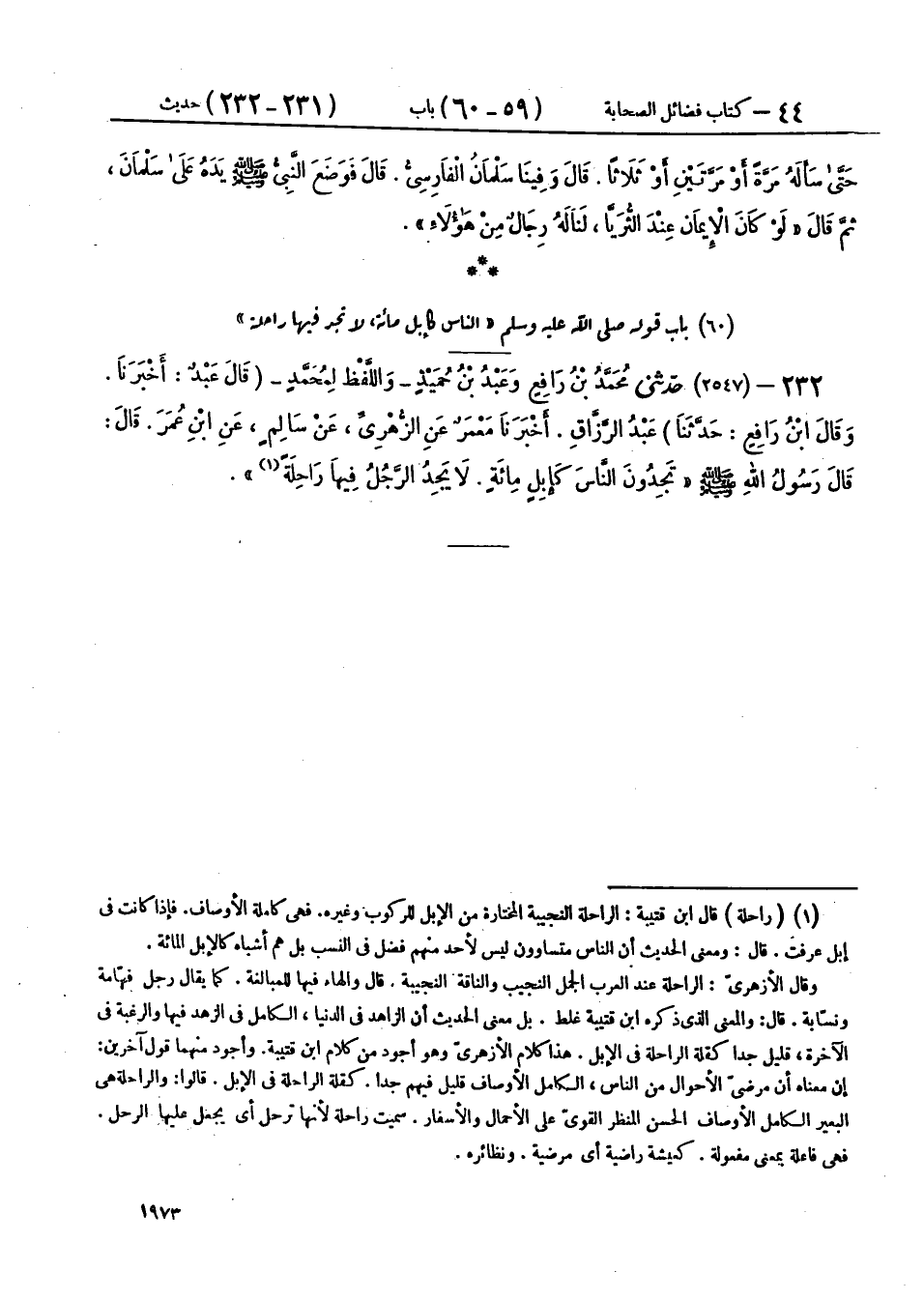232 - (2547) حَدَّثَنِي مُحَمَّدُ بْنُ رَافِعٍ، وَعَبْدُ بْنُ حُمَيْدٍ - وَاللَّفْظُ لِمُحَمَّدٍ قَالَ عَبْدٌ: أَخْبَرَنَا، وقَالَ ابْنُ رَافِعٍ: حَدَّثَنَا - عَبْدُ الرَّزَّاقِ، أَخْبَرَنَا مَعْمَرٌ، عَنِ الزُّهْرِيِّ، عَنْ سَالِمٍ، عَنِ ابْنِ عُمَرَ، قَالَ: قَالَ رَسُولُ اللهِ صَلَّى اللهُ عَلَيْهِ وَسَلَّمَ: «§تَجِدُونَ النَّاسَ كَإِبِلٍ مِائَةٍ، لَا يَجِدُ الرَّجُلُ فِيهَا رَاحِلَةً»