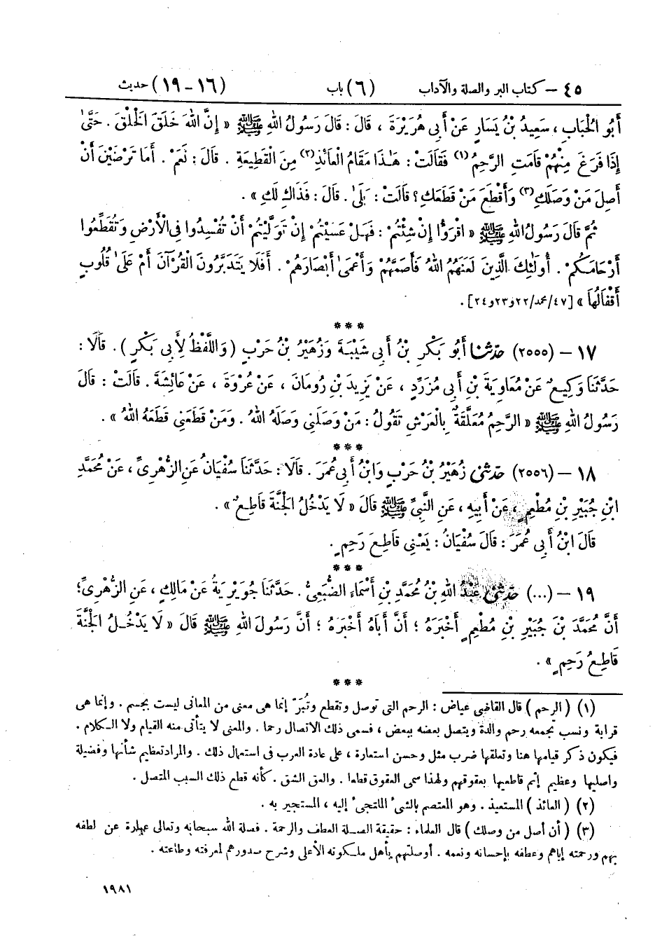 19 - (2556) حَدَّثَنِي عَبْدُ اللهِ بْنُ مُحَمَّدِ بْنِ أَسْمَاءَ الضُّبَعِيُّ، حَدَّثَنَا جُوَيْرِيَةُ، عَنْ مَالِكٍ، عَنِ الزُّهْرِيِّ، أَنَّ مُحَمَّدَ بْنَ جُبَيْرِ بْنِ مُطْعِمٍ، أَخْبَرَهُ أَنَّ أَبَاهُ، أَخْبَرَهُ أَنَّ رَسُولَ اللهِ صَلَّى اللهُ عَلَيْهِ وَسَلَّمَ، قَالَ: «§لَا يَدْخُلُ الْجَنَّةَ قَاطِعُ رَحِمٍ»