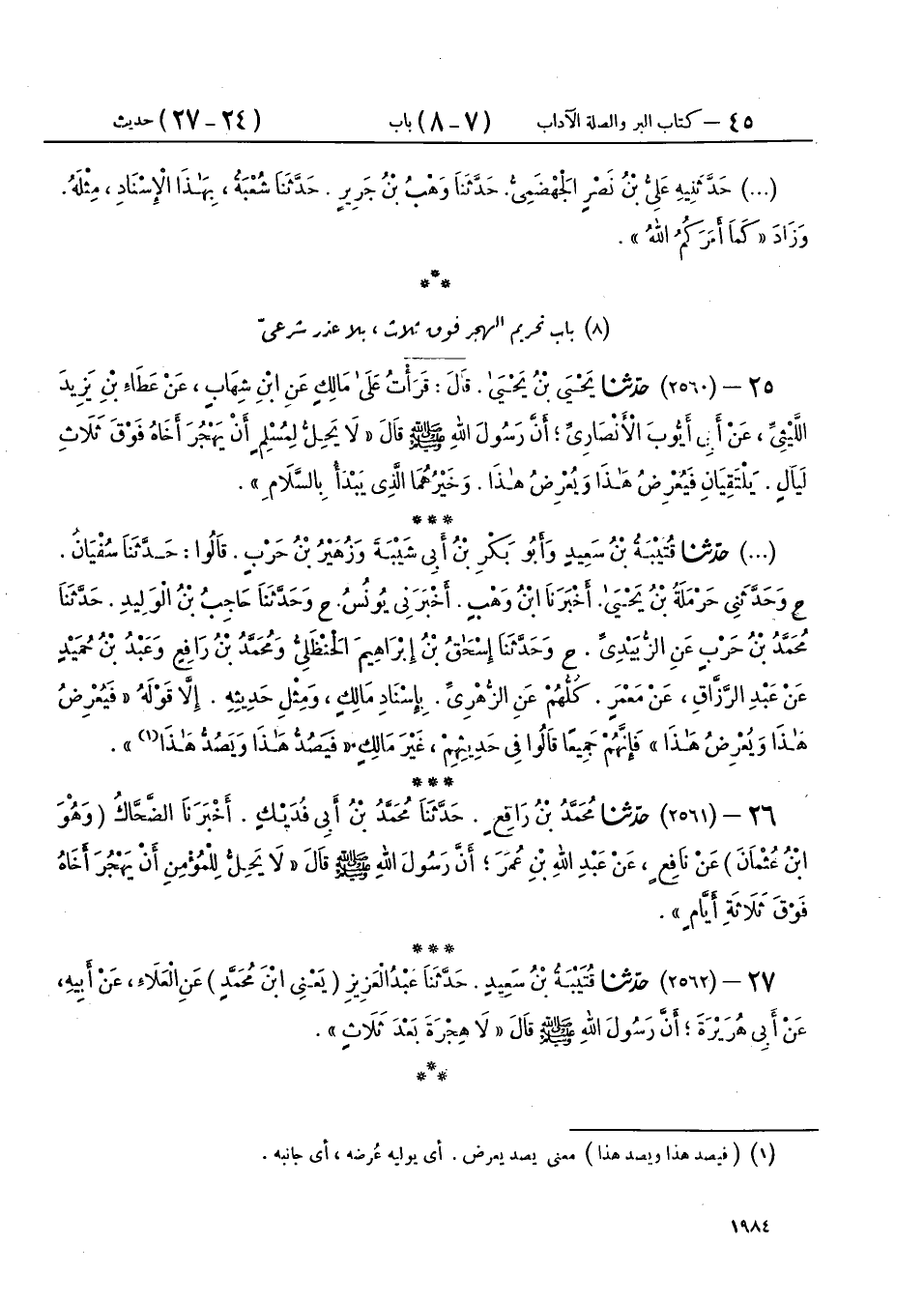 25 - (2560) حَدَّثَنَا يَحْيَى بْنُ يَحْيَى، قَالَ: قَرَأْتُ عَلَى مَالِكٍ، عَنِ ابْنِ شِهَابٍ، عَنْ عَطَاءِ بْنِ يَزِيدَ اللَّيْثِيِّ، عَنْ أَبِي أَيُّوبَ الْأَنْصَارِيِّ، أَنَّ رَسُولَ اللهِ صَلَّى اللهُ عَلَيْهِ وَسَلَّمَ، قَالَ: «§لَا يَحِلُّ لِمُسْلِمٍ أَنْ يَهْجُرَ أَخَاهُ فَوْقَ ثَلَاثِ لَيَالٍ، يَلْتَقِيَانِ فَيُعْرِضُ هَذَا وَيُعْرِضُ هَذَا، وَخَيْرُهُمَا الَّذِي يَبْدَأُ بِالسَّلَامِ»