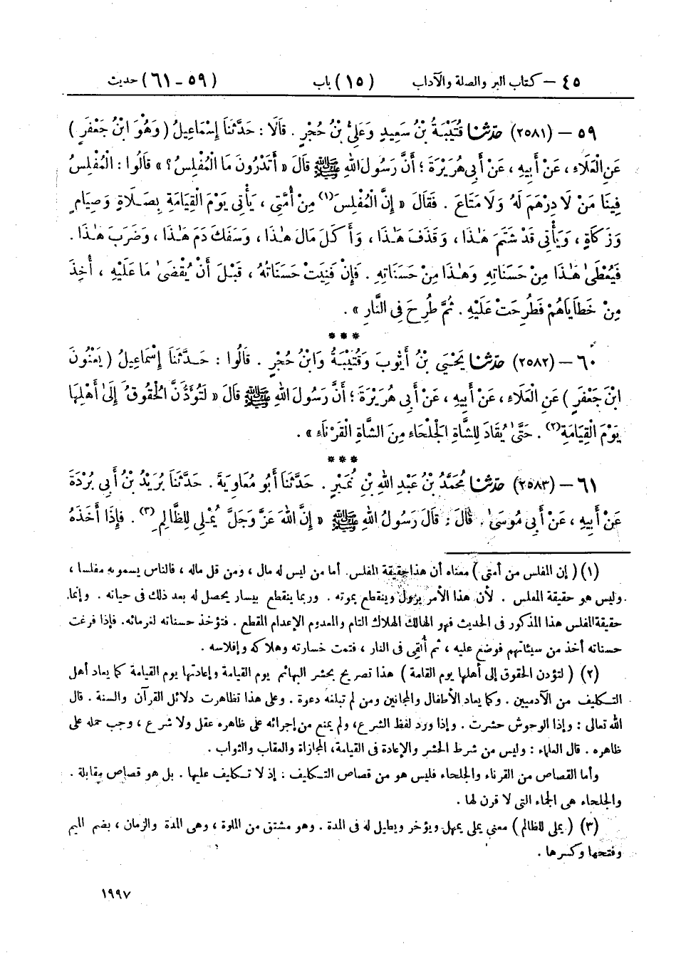 59 - (2581) حَدَّثَنَا قُتَيْبَةُ بْنُ سَعِيدٍ، وَعَلِيُّ بْنُ حُجْرٍ، قَالَا: حَدَّثَنَا إِسْمَاعِيلُ وَهُوَ ابْنُ جَعْفَرٍ، عَنِ الْعَلَاءِ، عَنْ أَبِيهِ، عَنْ أَبِي هُرَيْرَةَ، أَنَّ رَسُولَ اللهِ صَلَّى اللهُ عَلَيْهِ وَسَلَّمَ، قَالَ: «§أَتَدْرُونَ مَا الْمُفْلِسُ؟» قَالُوا: الْمُفْلِسُ فِينَا مَنْ لَا دِرْهَمَ لَهُ وَلَا مَتَاعَ، فَقَالَ: «إِنَّ الْمُفْلِسَ مِنْ أُمَّتِي يَأْتِي يَوْمَ الْقِيَامَةِ بِصَلَاةٍ، وَصِيَامٍ، وَزَكَاةٍ، وَيَأْتِي قَدْ شَتَمَ هَذَا، وَقَذَفَ هَذَا، وَأَكَلَ مَالَ هَذَا، وَسَفَكَ دَمَ هَذَا، وَضَرَبَ هَذَا، فَيُعْطَى هَذَا مِنْ حَسَنَاتِهِ، وَهَذَا مِنْ حَسَنَاتِهِ، فَإِنْ فَنِيَتْ حَسَنَاتُهُ قَبْلَ أَنْ يُقْضَى مَا عَلَيْهِ أُخِذَ مِنْ خَطَايَاهُمْ فَطُرِحَتْ عَلَيْهِ، ثُمَّ طُرِحَ فِي النَّارِ»