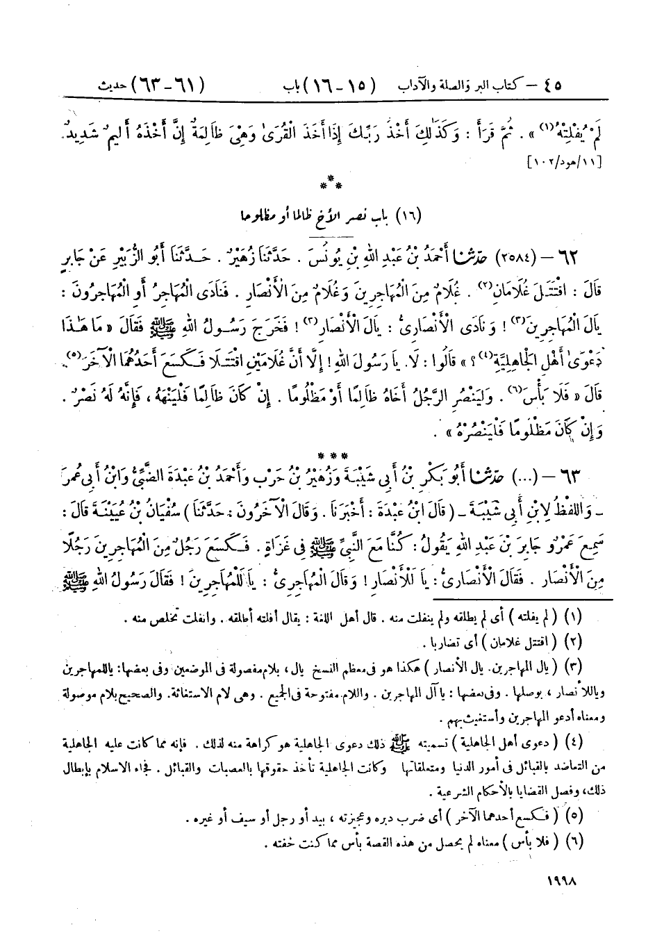 62 - (2584) حَدَّثَنَا أَحْمَدُ بْنُ عَبْدِ اللهِ بْنِ يُونُسَ، حَدَّثَنَا زُهَيْرٌ، حَدَّثَنَا أَبُو الزُّبَيْرِ، عَنْ جَابِرٍ، قَالَ: اقْتَتَلَ غُلَامَانِ غُلَامٌ مِنَ الْمُهَاجِرِينَ، وَغُلَامٌ مِنَ الْأَنْصَارِ، فَنَادَى الْمُهَاجِرُ أَوِ الْمُهَاجِرُونَ، يَا لَلْمُهَاجِرِينَ وَنَادَى الْأَنْصَارِيُّ يَا لَلْأَنْصَارِ، فَخَرَجَ رَسُولُ اللهِ صَلَّى اللهُ عَلَيْهِ وَسَلَّمَ، فَقَالَ: «مَا هَذَا دَعْوَى أَهْلِ الْجَاهِلِيَّةِ» قَالُوا: لَا يَا رَسُولَ اللهِ إِلَّا أَنَّ غُلَامَيْنِ اقْتَتَلَا فَكَسَعَ أَحَدُهُمَا الْآخَرَ، قَالَ: «فَلَا بَأْسَ §وَلْيَنْصُرِ الرَّجُلُ أَخَاهُ ظَالِمًا أَوْ مَظْلُومًا، إِنْ كَانَ ظَالِمًا فَلْيَنْهَهُ، فَإِنَّهُ لَهُ نَصْرٌ وَإِنْ كَانَ مَظْلُومًا فَلْيَنْصُرْهُ»
