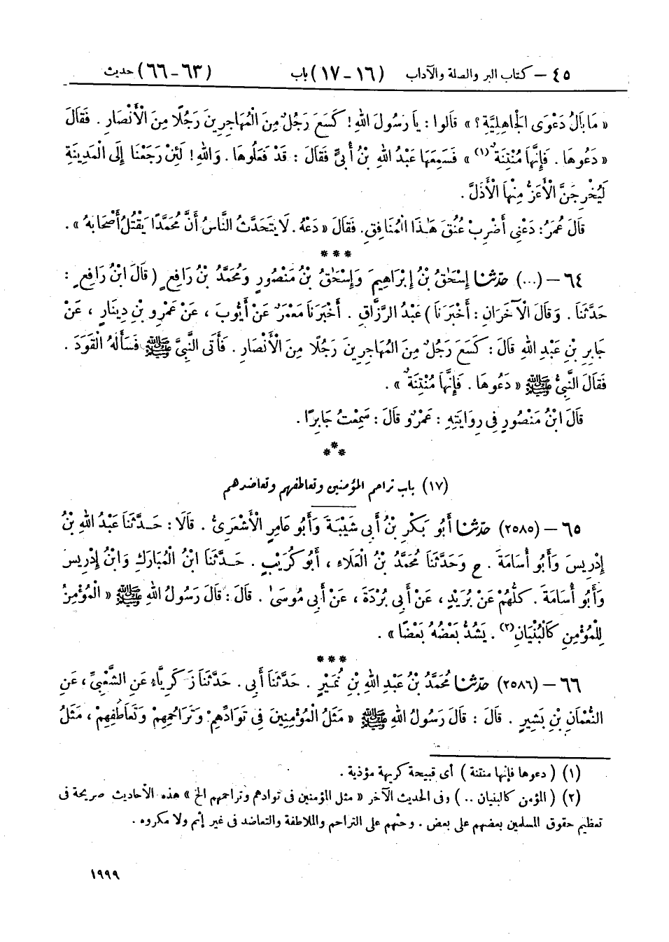 66 - (2586) حَدَّثَنَا مُحَمَّدُ بْنُ عَبْدِ اللهِ بْنِ نُمَيْرٍ، حَدَّثَنَا أَبِي، حَدَّثَنَا زَكَرِيَّاءُ، عَنِ الشَّعْبِيِّ، عَنِ النُّعْمَانِ بْنِ بَشِيرٍ، قَالَ: قَالَ رَسُولُ اللهِ صَلَّى اللهُ عَلَيْهِ وَسَلَّمَ: " §مَثَلُ الْمُؤْمِنِينَ فِي تَوَادِّهِمْ، وَتَرَاحُمِهِمْ، وَتَعَاطُفِهِمْ مَثَلُ الْجَسَدِ إِذَا اشْتَكَى مِنْهُ عُضْوٌ تَدَاعَى لَهُ سَائِرُ الْجَسَدِ بِالسَّهَرِ وَالْحُمَّى