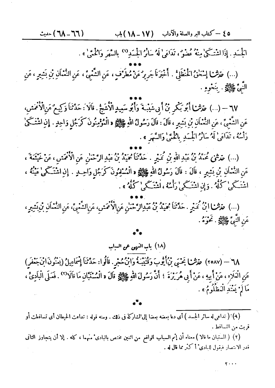 67 - حَدَّثَنِي مُحَمَّدُ بْنُ عَبْدِ اللهِ بْنِ نُمَيْرٍ، حَدَّثَنَا حُمَيْدُ بْنُ عَبْدِ الرَّحْمَنِ، عَنِ الْأَعْمَشِ، عَنْ خَيْثَمَةَ، عَنِ النُّعْمَانِ بْنِ بَشِيرٍ، قَالَ: قَالَ رَسُولُ اللهِ صَلَّى اللهُ عَلَيْهِ وَسَلَّمَ: «§الْمُسْلِمُونَ كَرَجُلٍ وَاحِدٍ، إِنِ اشْتَكَى عَيْنُهُ، اشْتَكَى كُلُّهُ، وَإِنِ اشْتَكَى، رَأْسُهُ اشْتَكَى كُلُّهُ»