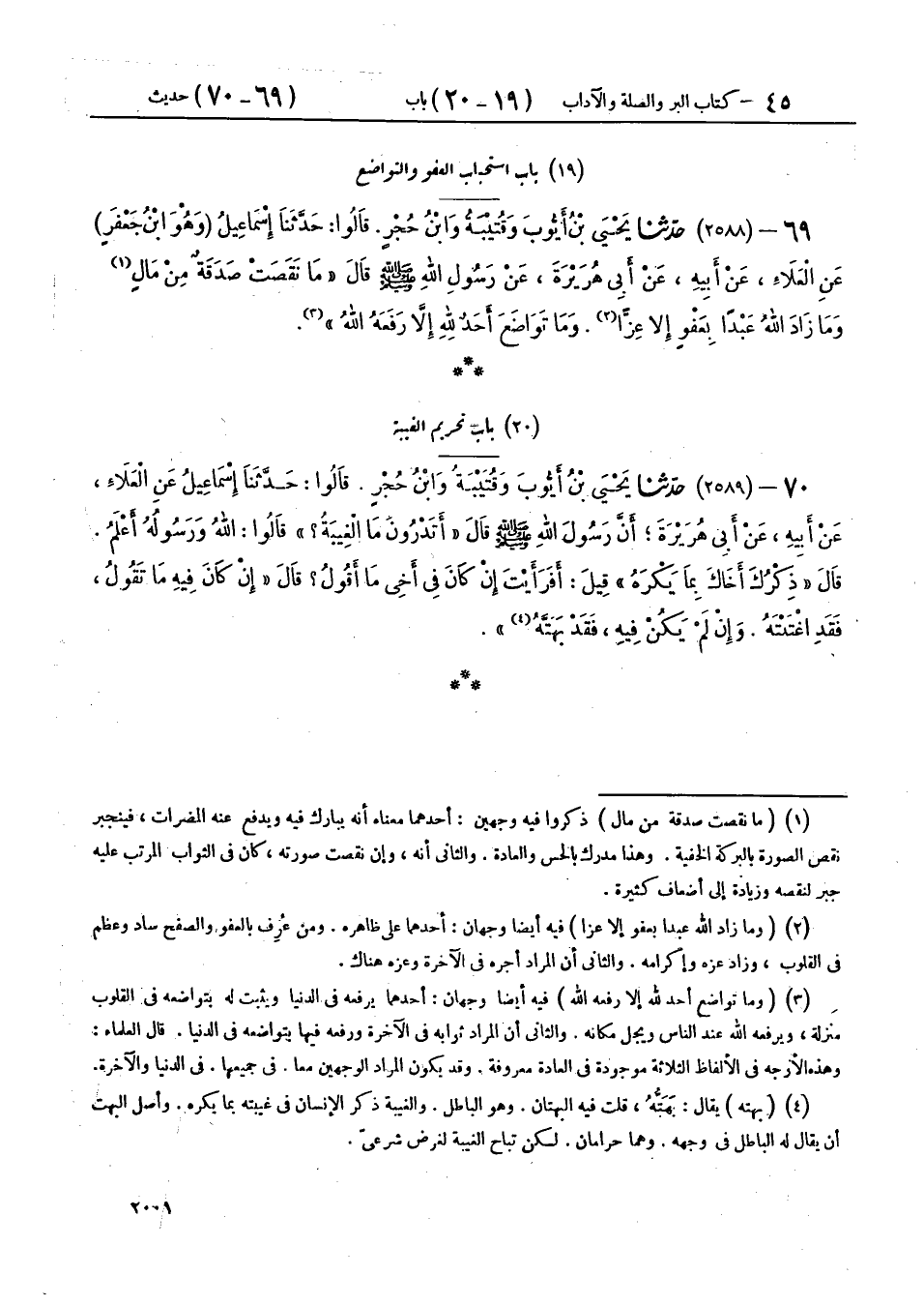 69 - (2588) حَدَّثَنَا يَحْيَى بْنُ أَيُّوبَ، وَقُتَيْبَةُ، وَابْنُ حُجْرٍ، قَالُوا: حَدَّثَنَا إِسْمَاعِيلُ وَهُوَ ابْنُ جَعْفَرٍ، عَنِ الْعَلَاءِ، عَنْ أَبِيهِ، عَنْ أَبِي هُرَيْرَةَ، عَنْ رَسُولِ اللهِ صَلَّى اللهُ عَلَيْهِ وَسَلَّمَ، قَالَ: «§مَا نَقَصَتْ صَدَقَةٌ مِنْ مَالٍ، وَمَا زَادَ اللهُ عَبْدًا بِعَفْوٍ، إِلَّا عِزًّا، وَمَا تَوَاضَعَ أَحَدٌ لِلَّهِ إِلَّا رَفَعَهُ اللهُ»