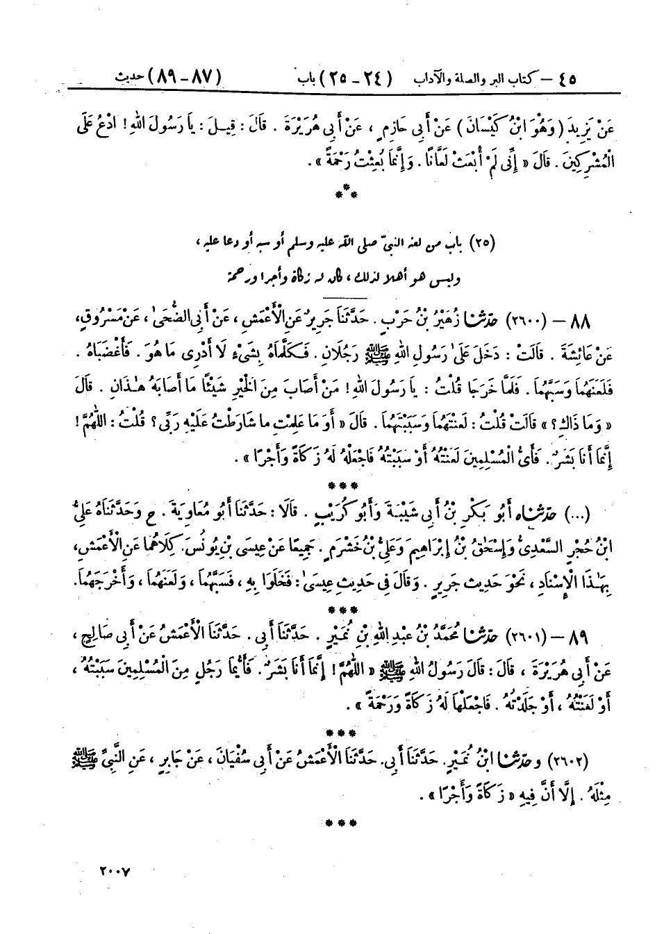 89 - (2601) حَدَّثَنَا مُحَمَّدُ بْنُ عَبْدِ اللهِ بْنِ نُمَيْرٍ، حَدَّثَنَا أَبِي، حَدَّثَنَا الْأَعْمَشُ، عَنْ أَبِي صَالِحٍ، عَنْ أَبِي هُرَيْرَةَ، قَالَ: قَالَ رَسُولُ اللهِ صَلَّى اللهُ عَلَيْهِ وَسَلَّمَ: «§اللهُمَّ إِنَّمَا أَنَا بَشَرٌ، فَأَيُّمَا رَجُلٍ مِنَ الْمُسْلِمِينَ سَبَبْتُهُ، أَوْ لَعَنْتُهُ، أَوْ جَلَدْتُهُ، فَاجْعَلْهَا لَهُ زَكَاةً وَرَحْمَةً»