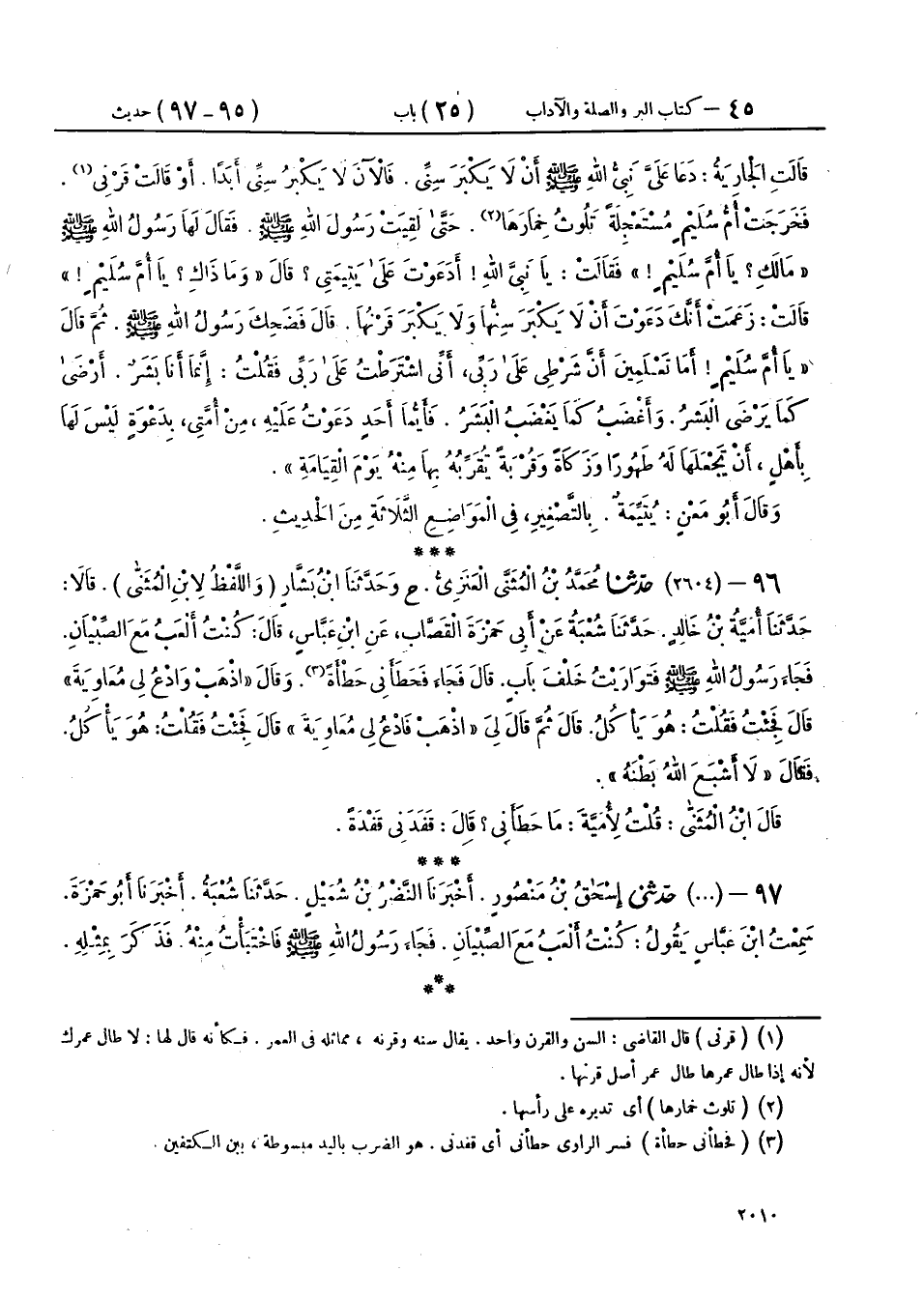 96 - (2604) حَدَّثَنَا مُحَمَّدُ بْنُ الْمُثَنَّى الْعَنَزِيُّ، ح وَحَدَّثَنَا ابْنُ بَشَّارٍ، - وَاللَّفْظُ لِابْنِ الْمُثَنَّى - قَالَا: حَدَّثَنَا أُمَيَّةُ بْنُ خَالِدٍ، حَدَّثَنَا شُعْبَةُ، عَنْ أَبِي حَمْزَةَ الْقَصَّابِ، عَنِ ابْنِ عَبَّاسٍ، قَالَ: كُنْتُ أَلْعَبُ مَعَ الصِّبْيَانِ، فَجَاءَ رَسُولُ اللهِ صَلَّى اللهُ عَلَيْهِ وَسَلَّمَ فَتَوَارَيْتُ خَلْفَ بَابٍ، قَالَ فَجَاءَ فَحَطَأَنِي حَطْأَةً، وَقَالَ: «اذْهَبْ وَادْعُ لِي مُعَاوِيَةَ» قَالَ: فَجِئْتُ فَقُلْتُ: هُوَ يَأْكُلُ، قَالَ: ثُمَّ قَالَ لِيَ: «اذْهَبْ فَادْعُ لِي مُعَاوِيَةَ» قَالَ: فَجِئْتُ فَقُلْتُ: هُوَ يَأْكُلُ، فَقَالَ: «§لَا أَشْبَعَ اللهُ بَطْنَهُ» قَالَ ابْنُ الْمُثَنَّى: قُلْتُ لِأُمَيَّةَ: مَا حَطَأَنِي؟ قَالَ: قَفَدَنِي قَفْدَةً