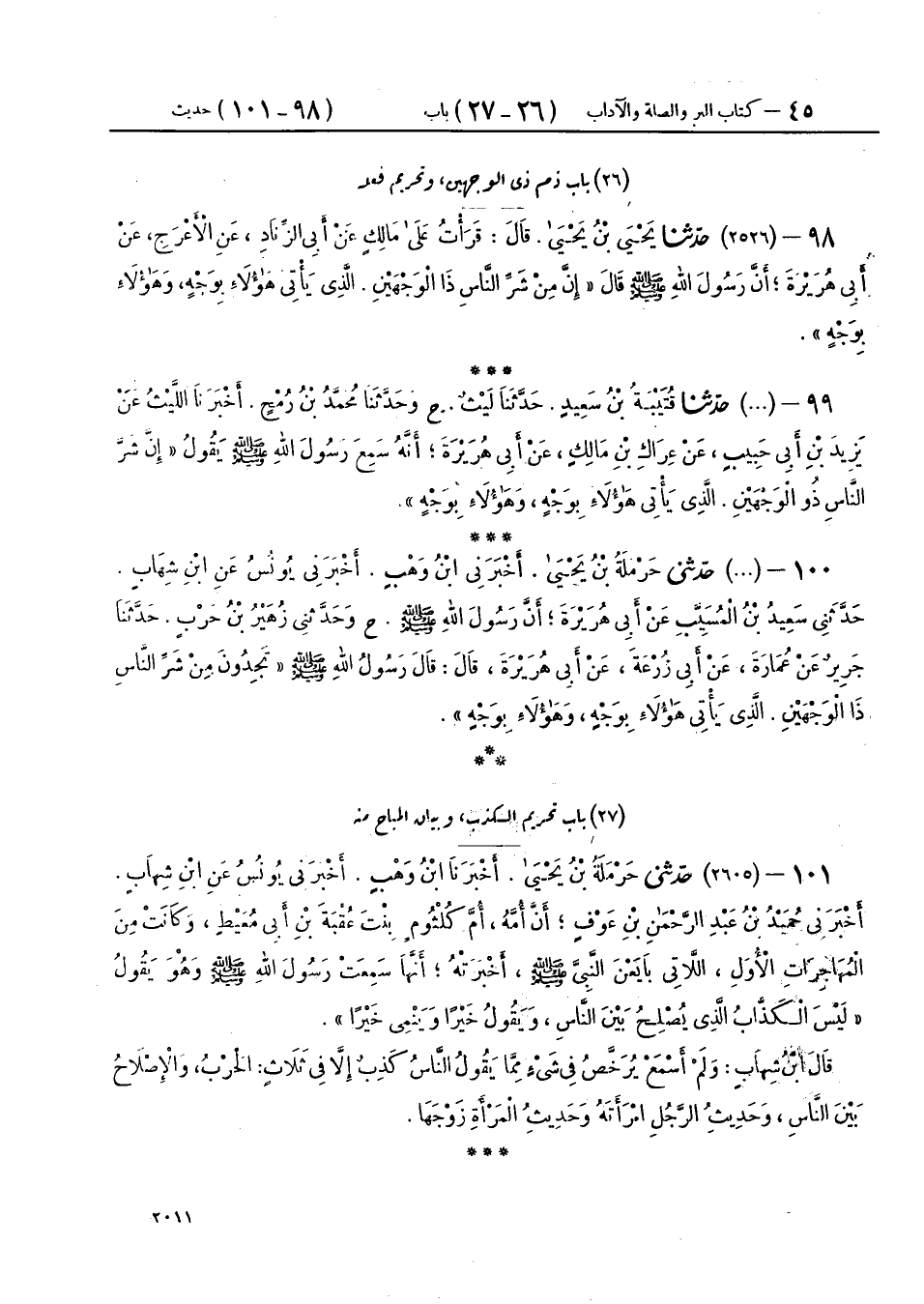 98 - (2526) حَدَّثَنَا يَحْيَى بْنُ يَحْيَى، قَالَ: قَرَأْتُ عَلَى مَالِكٍ، عَنْ أَبِي الزِّنَادِ، عَنِ الْأَعْرَجِ، عَنْ أَبِي هُرَيْرَةَ، أَنَّ رَسُولَ اللهِ صَلَّى اللهُ عَلَيْهِ وَسَلَّمَ، قَالَ: «إِنَّ §مِنْ شَرِّ النَّاسِ، ذَا الْوَجْهَيْنِ، الَّذِي يَأْتِي هَؤُلَاءِ بِوَجْهٍ، وَهَؤُلَاءِ بِوَجْهٍ»
