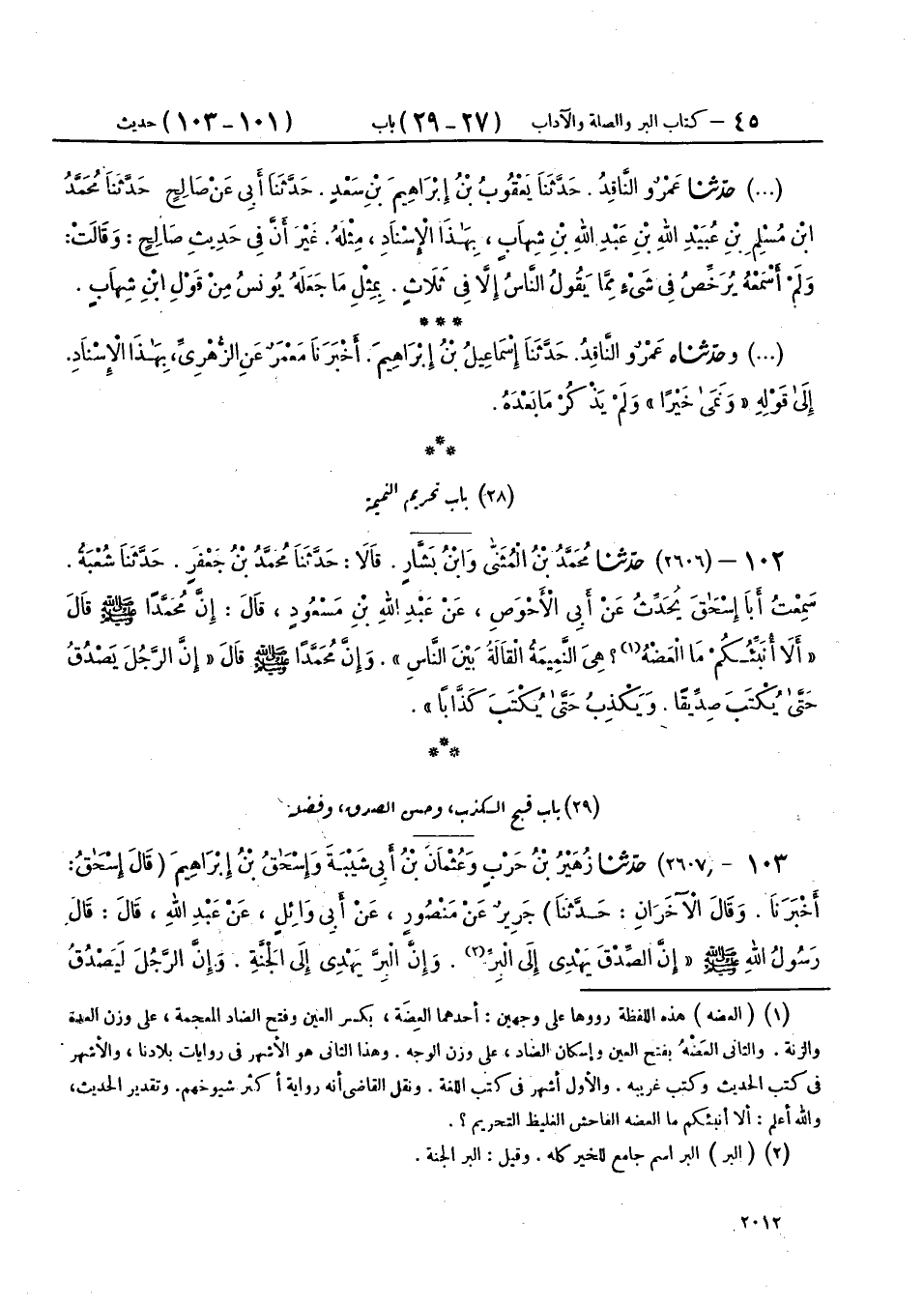 103 - (2607) حَدَّثَنَا زُهَيْرُ بْنُ حَرْبٍ، وَعُثْمَانُ بْنُ أَبِي شَيْبَةَ، وَإِسْحَاقُ بْنُ إِبْرَاهِيمَ - قَالَ: إِسْحَاقُ: أَخْبَرَنَا، وقَالَ الْآخَرَانِ: حَدَّثَنَا - جَرِيرٌ، عَنْ مَنْصُورٍ، عَنْ أَبِي وَائِلٍ، عَنْ عَبْدِ اللهِ، قَالَ: قَالَ رَسُولُ اللهِ صَلَّى اللهُ عَلَيْهِ وَسَلَّمَ: «إِنَّ §الصِّدْقَ يَهْدِي إِلَى الْبِرِّ، وَإِنَّ الْبِرَّ يَهْدِي إِلَى الْجَنَّةِ، وَإِنَّ الرَّجُلَ لَيَصْدُقُ حَتَّى يُكْتَبَ صِدِّيقًا، وَإِنَّ الْكَذِبَ يَهْدِي إِلَى الْفُجُورِ، وَإِنَّ الْفُجُورَ يَهْدِي إِلَى النَّارِ، وَإِنَّ الرَّجُلَ لَيَكْذِبُ حَتَّى يُكْتَبَ كَذَّابًا»