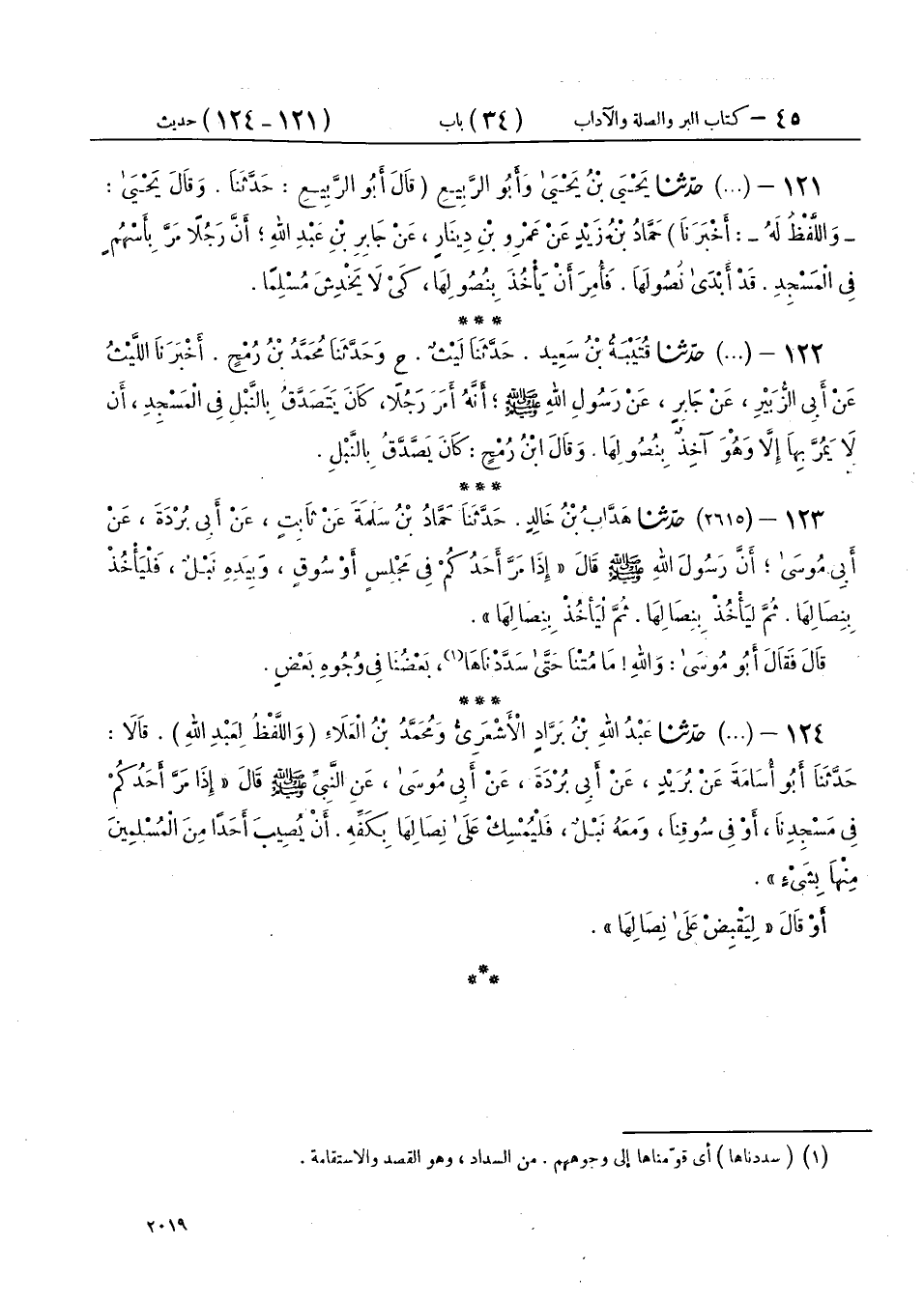 123 - (2615) حَدَّثَنَا هَدَّابُ بْنُ خَالِدٍ، حَدَّثَنَا حَمَّادُ بْنُ سَلَمَةَ، عَنْ ثَابِتٍ، عَنْ أَبِي بُرْدَةَ، عَنْ أَبِي مُوسَى، أَنَّ رَسُولَ اللهِ صَلَّى اللهُ عَلَيْهِ وَسَلَّمَ، قَالَ: «§إِذَا مَرَّ أَحَدُكُمْ فِي مَجْلِسٍ أَوْ سُوقٍ، وَبِيَدِهِ نَبْلٌ، فَلْيَأْخُذْ بِنِصَالِهَا، ثُمَّ لِيَأْخُذْ بِنِصَالِهَا، ثُمَّ لِيَأْخُذْ بِنِصَالِهَا» قَالَ: فَقَالَ أَبُو مُوسَى: وَاللهِ مَا مُتْنَا حَتَّى سَدَّدْنَاهَا بَعْضُنَا فِي وُجُوهِ بَعْضٍ
