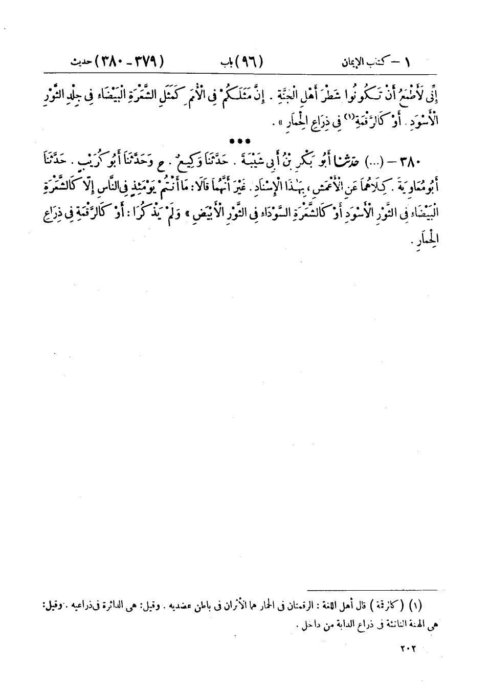 380 - (222) حَدَّثَنَا أَبُو بَكْرِ بْنُ أَبِي شَيْبَةَ، حَدَّثَنَا وَكِيعٌ ح، وَحَدَّثَنَا أَبُو كُرَيْبٍ، حَدَّثَنَا أَبُو مُعَاوِيَةَ، كِلَاهُمَا عَنِ الْأَعْمَشِ بِهَذَا الْإِسْنَادِ غَيْرَ أَنَّهُمَا قَالَا: مَا أَنْتُمْ يَوْمَئِذٍ فِي النَّاسِ إِلَّا كَالشَّعْرَةِ الْبَيْضَاءِ فِي الثَّوْرِ الْأَسْوَدِ أَوْ كَالشَّعْرَةِ السَّوْدَاءِ فِي الثَّوْرِ الْأَبْيَضِ وَلَمْ يَذْكُرَا أَوِ الرَّقْمَةِ فِي ذِرَاعِ الْحِمَارِ
