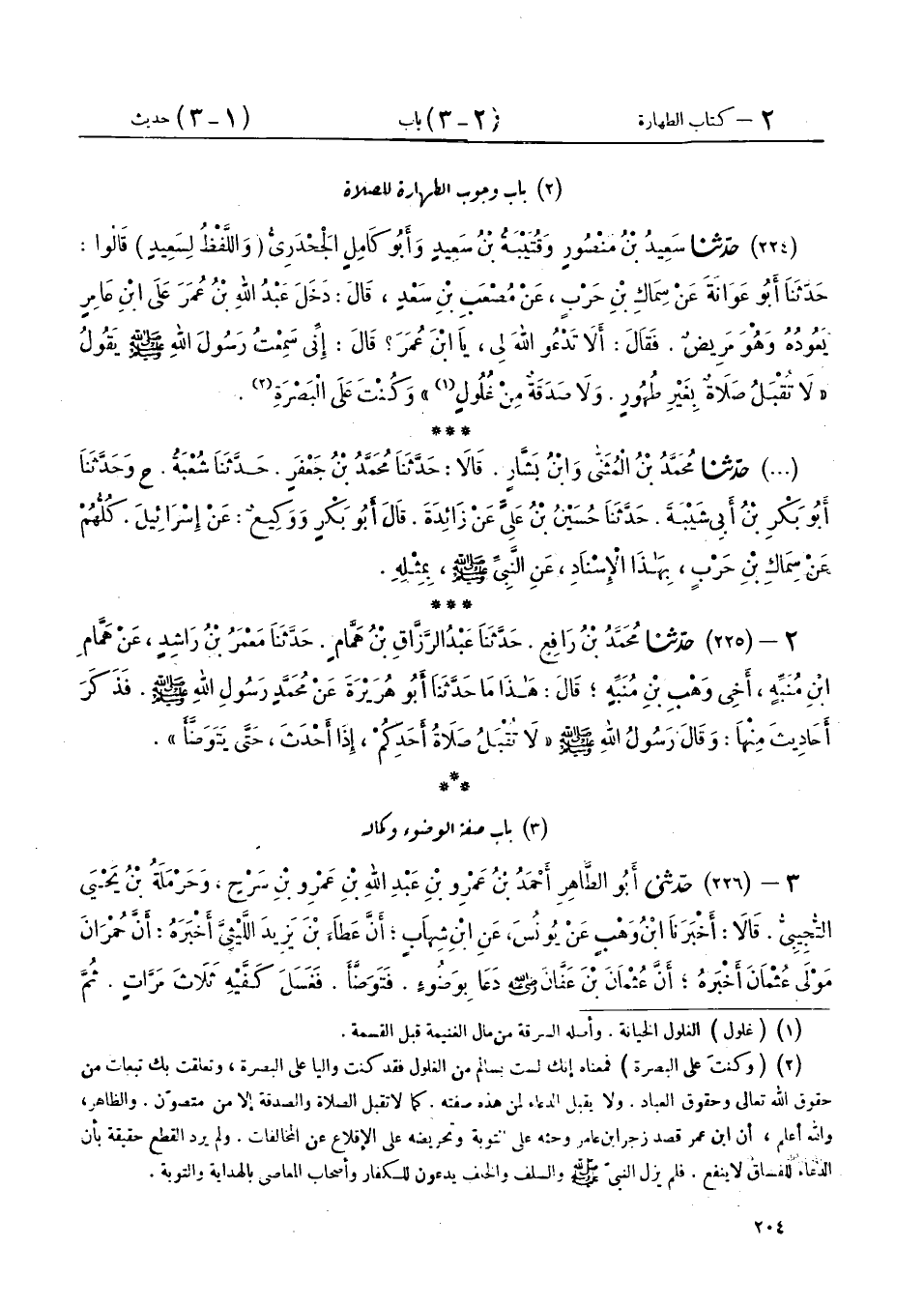 3 - (226) حَدَّثَنِي أَبُو الطَّاهِرِ أَحْمَدُ بْنُ عَمْرِو بْنِ عَبْدِ اللهِ بْنِ عَمْرِو بْنِ سَرْحٍ، وَحَرْمَلَةُ بْنُ يَحْيَى التُّجِيبِيُّ، قَالَا: أَخْبَرَنَا ابْنُ وَهْبٍ، عَنْ يُونُسَ، عَنِ ابْنِ شِهَابٍ أَنَّ عَطَاءَ بْنَ يَزِيدَ اللَّيْثِيَّ، أَخْبَرَهُ أَنَّ حُمْرَانَ، مَوْلَى عُثْمَانَ، أَخْبَرَهُ أَنَّ عُثْمَانَ بْنَ عَفَّانَ رَضِيَ اللهُ عَنْهُ: «دَعَا بِوَضُوءٍ فَتَوَضَّأَ فَغَسَلَ كَفَّيْهِ ثَلَاثَ مَرَّاتٍ، ثُمَّ مَضْمَضَ وَاسْتَنْثَرَ، ثُمَّ غَسَلَ وَجْهَهُ ثَلَاثَ مَرَّاتٍ، ثُمَّ غَسَلَ يَدَهُ الْيُمْنَى إِلَى الْمِرْفَقِ ثَلَاثَ مَرَّاتٍ، ثُمَّ غَسَلَ يَدَهُ الْيُسْرَى مِثْلَ ذَلِكَ، ثُمَّ مَسَحَ رَأْسَهُ، ثُمَّ غَسَلَ رِجْلَهُ الْيُمْنَى إِلَى الْكَعْبَيْنِ ثَلَاثَ مَرَّاتٍ، ثُمَّ غَسَلَ الْيُسْرَى مِثْلَ ذَلِكَ». ثُمَّ قَالَ: «رَأَيْتُ رَسُولَ اللهِ صَلَّى اللهُ عَلَيْهِ وَسَلَّمَ تَوَضَّأَ نَحْوَ وُضُوئِي هَذَا» ثُمَّ قَالَ رَسُولُ اللهِ صَلَّى اللهُ عَلَيْهِ وَسَلَّمَ: «§مَنْ تَوَضَّأَ نَحْوَ وُضُوئِي هَذَا ثُمَّ قَامَ فَرَكَعَ رَكْعَتَيْنِ لَا يُحَدِّثُ فِيهِمَا نَفْسَهُ غُفِرَ لَهُ مَا تَقَدَّمَ مِنْ ذَنْبِهِ» قَالَ ابْنُ شِهَابٍ: " وَكَانَ عُلَمَاؤُنَا يَقُولُونَ: هَذَا الْوُضُوءُ أَسْبَغُ مَا يَتَوَضَّأُ بِهِ أَحَدٌ لِلصَّلَاةِ "