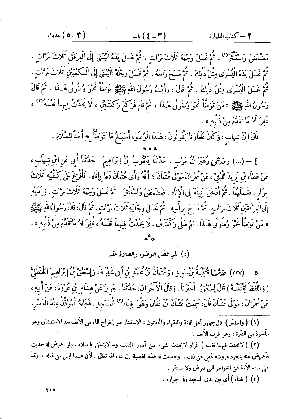 4 - (226) وحَدَّثَنِي زُهَيْرُ بْنُ حَرْبٍ، حَدَّثَنَا يَعْقُوبُ بْنُ إِبْرَاهِيمَ، حَدَّثَنَا أَبِي، عَنِ ابْنِ شِهَابٍ، عَنْ عَطَاءِ بْنِ يَزِيدَ اللَّيْثِيِّ، عَنْ حُمْرَانَ، مَوْلَى عُثْمَانَ أَنَّهُ رَأَى عُثْمَانَ دَعَا بِإِنَاءٍ فَأَفْرَغَ عَلَى كَفَّيْهِ ثَلَاثَ مِرَارٍ فَغَسَلَهُمَا، ثُمَّ أَدْخَلَ يَمِينَهُ فِي الْإِنَاءِ فَمَضْمَضَ وَاسْتَنْثَرَ، ثُمَّ غَسَلَ وَجْهَهُ ثَلَاثَ مَرَّاتٍ وَيَدَيْهِ إِلَى الْمِرْفَقَيْنِ ثَلَاثَ مَرَّاتٍ، ثُمَّ مَسَحَ بِرَأْسِهِ، ثُمَّ غَسَلَ رِجْلَيْهِ ثَلَاثَ مَرَّاتٍ "، ثُمَّ قَالَ: قَالَ رَسُولُ اللهِ صَلَّى اللهُ عَلَيْهِ وَسَلَّمَ: «§مَنْ تَوَضَّأَ نَحْوَ وُضُوئِي هَذَا، ثُمَّ صَلَّى رَكْعَتَيْنِ لَا يُحَدِّثُ فِيهِمَا نَفْسَهُ غُفِرَ لَهُ مَا تَقَدَّمَ مِنْ ذَنْبِهِ»