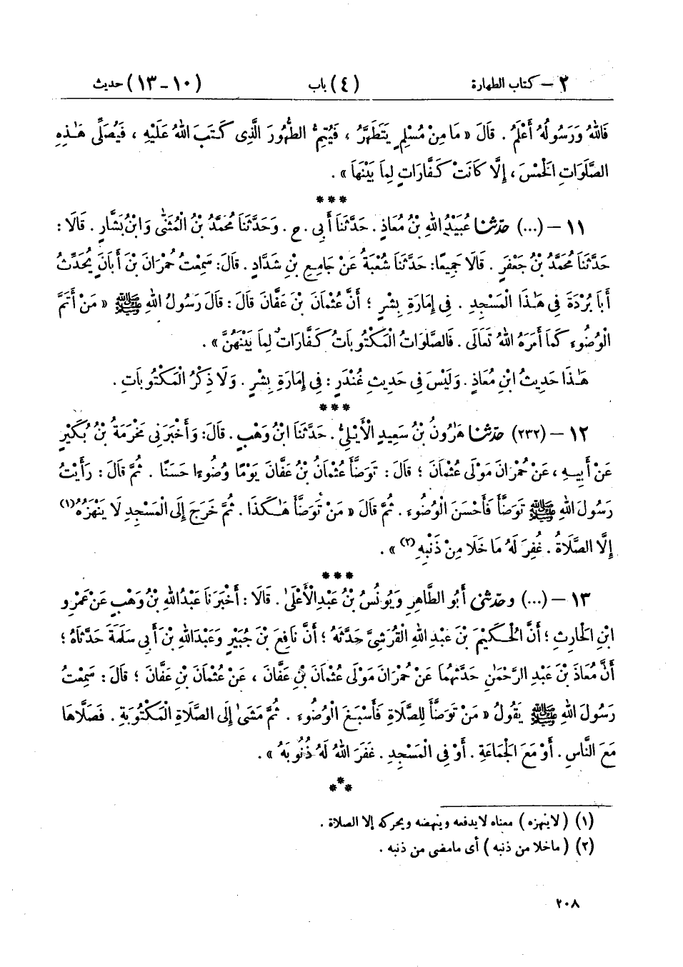 13 - (232) وَحَدَّثَنِي أَبُو الطَّاهِرِ، وَيُونُسُ بْنُ عَبْدِ الْأَعْلَى، قَالَا: أَخْبَرَنَا عَبْدُ اللهِ بْنُ وَهْبٍ، عَنْ عَمْرِو بْنِ الْحَارِثِ، أَنَّ الْحُكَيْمَ بْنَ عَبْدِ اللهِ الْقُرَشِيَّ، حَدَّثَهُ أَنَّ نَافِعَ بْنَ جُبَيْرٍ، وَعَبْدَ اللهِ بْنَ أَبِي سَلَمَةَ، حَدَّثَاهُ أَنَّ مُعَاذَ بْنَ عَبْدِ الرَّحْمَنِ، حَدَّثَهُمَا عَنْ حُمْرَانَ، مَوْلَى عُثْمَانَ بْنِ عَفَّانَ، عَنْ عُثْمَانَ بْنِ عَفَّانَ، قَالَ: سَمِعْتُ رَسُولَ اللهِ صَلَّى اللهُ عَلَيْهِ وَسَلَّمَ يَقُولُ: «§مَنْ تَوَضَّأَ لِلصَّلَاةِ فَأَسْبَغَ الْوُضُوءَ، ثُمَّ مَشَى إِلَى الصَّلَاةِ الْمَكْتُوبَةِ، فَصَلَّاهَا مَعَ النَّاسِ أَوْ مَعَ الْجَمَاعَةِ أَوْ فِي الْمَسْجِدِ غَفَرَ اللهُ لَهُ ذُنُوبَهُ»