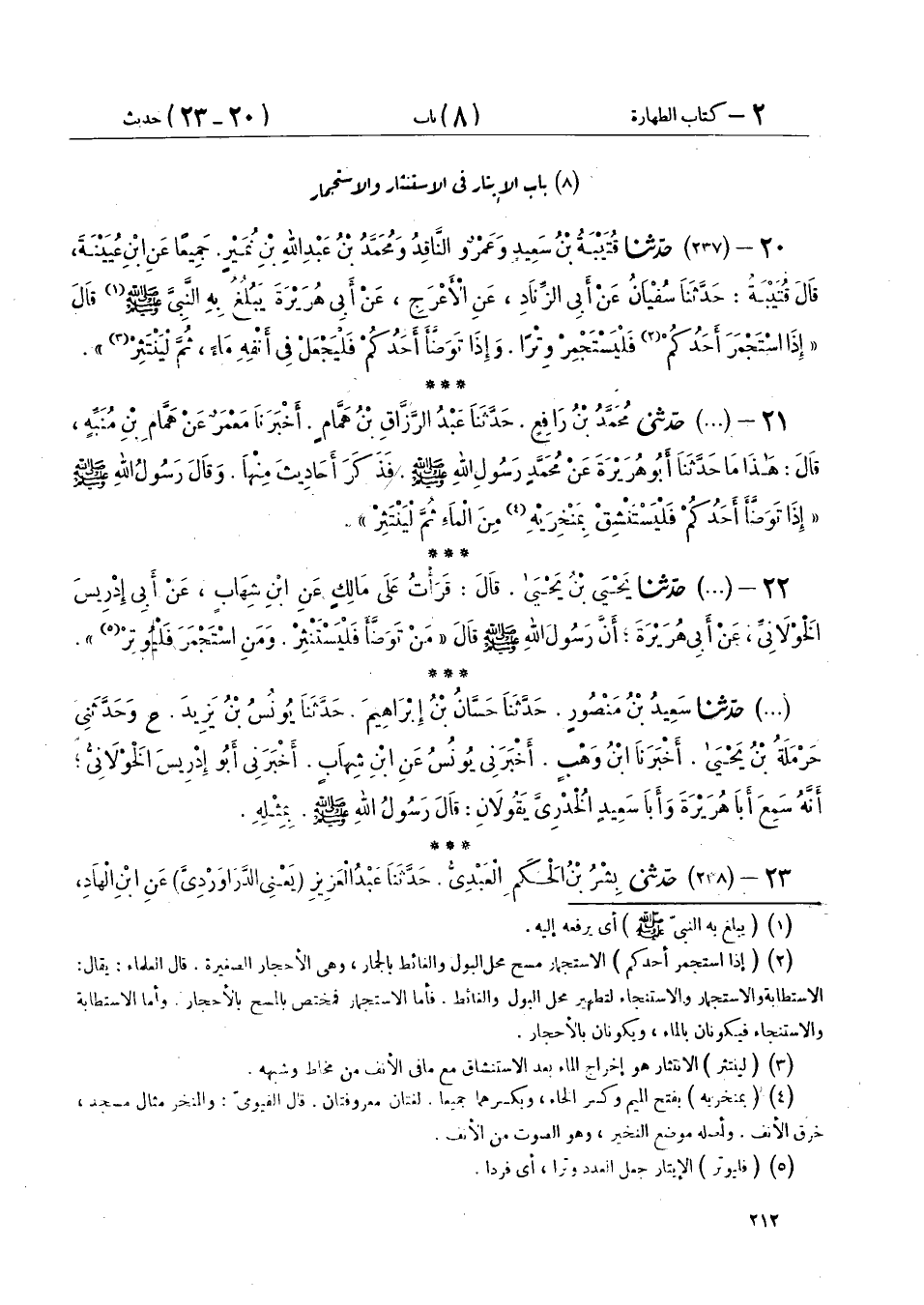 20 - (237) حَدَّثَنَا قُتَيْبَةُ بْنُ سَعِيدٍ، وَعَمْرٌو النَّاقِدُ، وَمُحَمَّدُ بْنُ عَبْدِ اللهِ بْنِ نُمَيْرٍ، جَمِيعًا عَنِ ابْنِ عُيَيْنَةَ، قَالَ قُتَيْبَةُ: حَدَّثَنَا سُفْيَانُ، عَنْ أَبِي الزِّنَادِ، عَنِ الْأَعْرَجِ، عَنْ أَبِي هُرَيْرَةَ، يَبْلُغُ بِهِ النَّبِيَّ صَلَّى اللهُ عَلَيْهِ وَسَلَّمَ قَالَ: «§إِذَا اسْتَجْمَرَ أَحَدُكُمْ فَلْيَسْتَجْمِرْ وِتْرًا، وَإِذَا تَوَضَّأَ أَحَدُكُمْ فَلِيَجْعَلْ فِي أَنْفِهِ مَاءً ثُمَّ لِيَنْتَثِرْ»