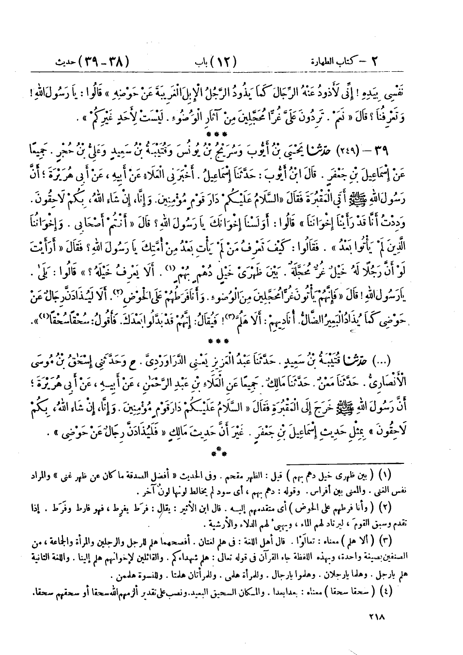 39 - (249) حَدَّثَنَا يَحْيَى بْنُ أَيُّوبَ، وَسُرَيْجُ بْنُ يُونُسَ، وَقُتَيْبَةُ بْنُ سَعِيدٍ، وَعَلِيُّ بْنُ حُجْرٍ، جَمِيعًا عَنْ إِسْمَاعِيلَ بْنِ جَعْفَرٍ - قَالَ ابْنُ أَيُّوبَ حَدَّثَنَا إِسْمَاعِيلُ - أَخْبَرَنِي الْعَلَاءُ، عَنْ أَبِيهِ، عَنْ أَبِي هُرَيْرَةَ، أَنَّ رَسُولَ اللهِ صَلَّى اللهُ عَلَيْهِ وَسَلَّمَ أَتَى الْمَقْبُرَةَ، فَقَالَ: «§السَّلَامُ عَلَيْكُمْ دَارَ قَوْمٍ مُؤْمِنِينَ، وَإِنَّا إِنْ شَاءَ اللهُ بِكُمْ لَاحِقُونَ، وَدِدْتُ أَنَّا قَدْ رَأَيْنَا إِخْوَانَنَا» قَالُوا: أَوَلَسْنَا إِخْوَانَكَ؟ يَا رَسُولَ اللهِ قَالَ: «أَنْتُمْ أَصْحَابِي وَإِخْوَانُنَا الَّذِينَ لَمْ يَأْتُوا بَعْدُ» فَقَالُوا: كَيْفَ تَعْرِفُ مَنْ لَمْ يَأْتِ بَعْدُ مِنْ أُمَّتِكَ؟ يَا رَسُولَ اللهِ فَقَالَ: «أَرَأَيْتَ لَوْ أَنَّ رَجُلًا لَهُ خَيْلٌ غُرٌّ مُحَجَّلَةٌ بَيْنَ ظَهْرَيْ خَيْلٍ دُهْمٍ بُهْمٍ أَلَا يَعْرِفُ خَيْلَهُ؟» قَالُوا: بَلَى يَا رَسُولَ اللهِ قَالَ: " فَإِنَّهُمْ يَأْتُونَ غُرًّا مُحَجَّلِينَ مِنَ الْوُضُوءِ، وَأَنَا فَرَطُهُمْ عَلَى الْحَوْضِ أَلَا لَيُذَادَنَّ رِجَالٌ عَنْ حَوْضِي كَمَا يُذَادُ الْبَعِيرُ الضَّالُّ أُنَادِيهِمْ أَلَا هَلُمَّ فَيُقَالُ: إِنَّهُمْ قَدْ بَدَّلُوا بَعْدَكَ فَأَقُولُ سُحْقًا سُحْقًا "
