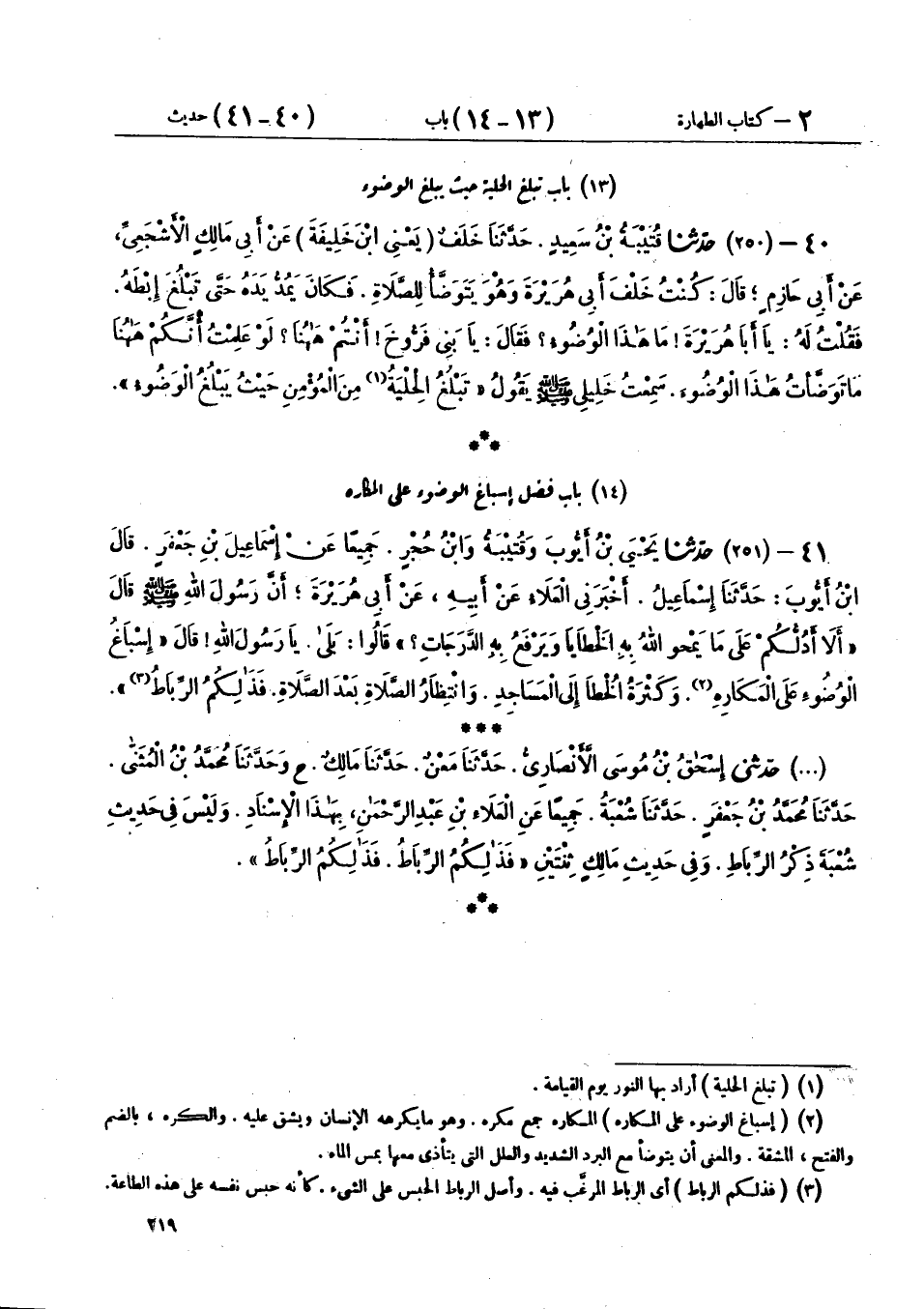 41 - (251) حَدَّثَنَا يَحْيَى بْنُ أَيُّوبَ، وَقُتَيْبَةُ، وَابْنُ حُجْرٍ جَمِيعًا عَنْ إِسْمَاعِيلَ بْنِ جَعْفَرٍ - قَالَ ابْنُ أَيُّوبَ: حَدَّثَنَا إِسْمَاعِيلُ - أَخْبَرَنِي الْعَلَاءُ، عَنْ أَبِيهِ، عَنْ أَبِي هُرَيْرَةَ، أَنَّ رَسُولَ اللهِ صَلَّى اللهُ عَلَيْهِ وَسَلَّمَ قَالَ: «أَلَا أَدُلُّكُمْ عَلَى مَا يَمْحُو اللهُ بِهِ الْخَطَايَا، وَيَرْفَعُ بِهِ الدَّرَجَاتِ؟» قَالُوا بَلَى يَا رَسُولَ اللهِ قَالَ: «§إِسْبَاغُ الْوُضُوءِ عَلَى الْمَكَارِهِ، وَكَثْرَةُ الْخُطَا إِلَى الْمَسَاجِدِ، وَانْتِظَارُ الصَّلَاةِ بَعْدَ الصَّلَاةِ، فَذَلِكُمُ الرِّبَاطُ»