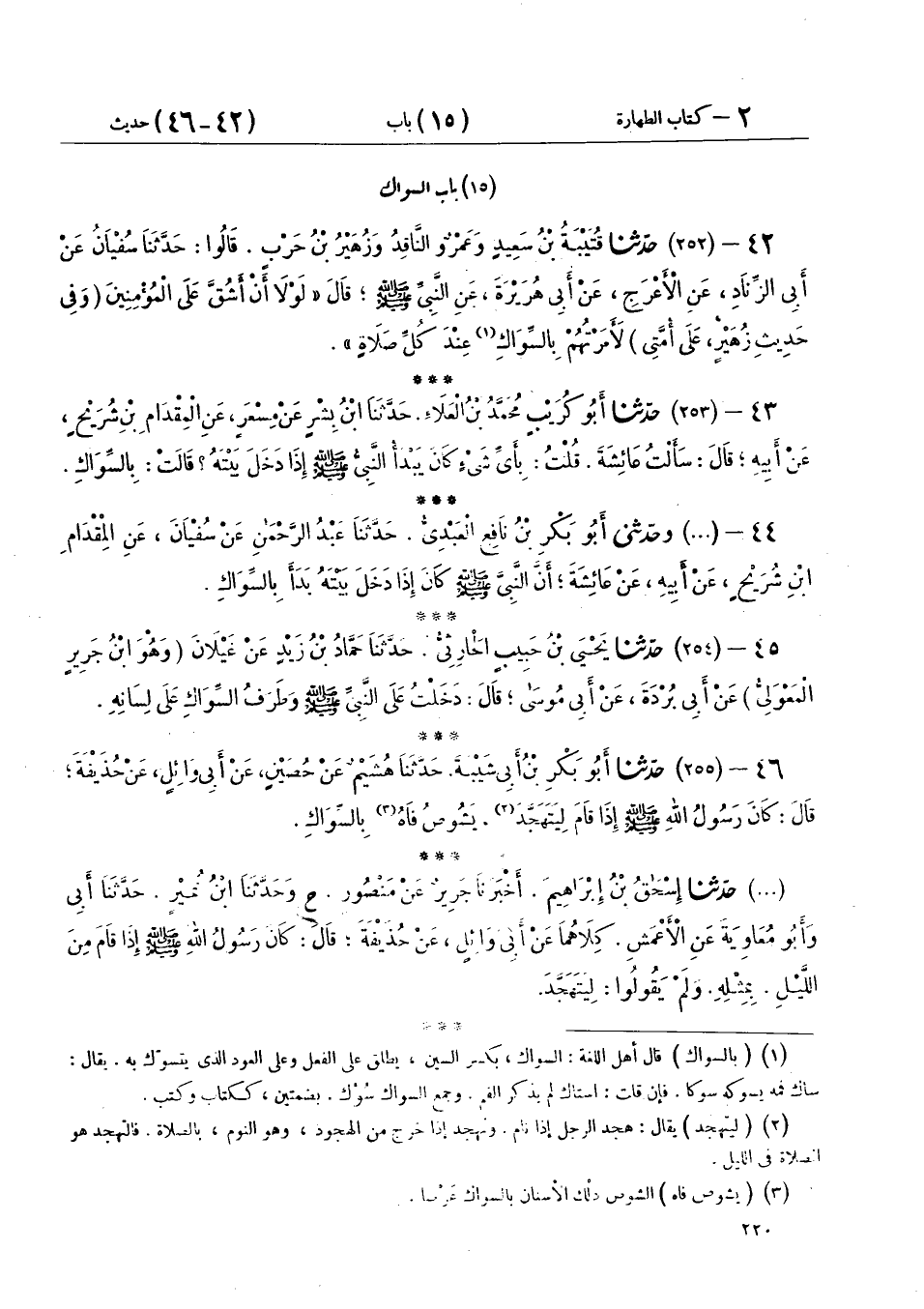 46 - (255) حَدَّثَنَا أَبُو بَكْرِ بْنُ أَبِي شَيْبَةَ، حَدَّثَنَا هُشَيْمٌ، عَنْ حُصَيْنٍ، عَنْ أَبِي وَائِلٍ، عَنْ حُذَيْفَةَ، قَالَ: «كَانَ رَسُولُ اللهِ صَلَّى اللهُ عَلَيْهِ وَسَلَّمَ §إِذَا قَامَ لِيَتَهَجَّدَ يَشُوصُ فَاهُ بِالسِّوَاكِ».