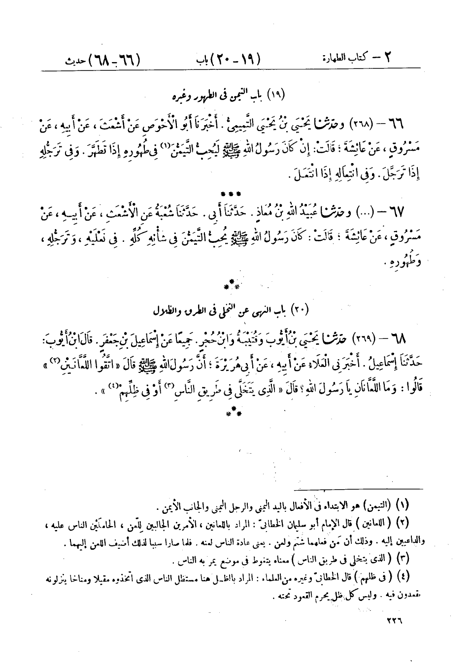 66 - (268) وحَدَّثَنَا يَحْيَى بْنُ يَحْيَى التَّمِيمِيُّ، أَخْبَرَنَا أَبُو الْأَحْوَصِ، عَنْ أَشْعَثَ، عَنْ أَبِيهِ، عَنْ مَسْرُوقٍ، عَنْ عَائِشَةَ، قَالَتْ: إِنْ كَانَ رَسُولُ اللهِ صَلَّى اللهُ عَلَيْهِ وَسَلَّمَ: «§لَيُحِبُّ التَّيَمُّنَ فِي طُهُورِهِ إِذَا تَطَهَّرَ، وَفِي تَرَجُّلِهِ، إِذَا تَرَجَّلَ، وَفِي انْتِعَالِهِ إِذَا انْتَعَلَ»