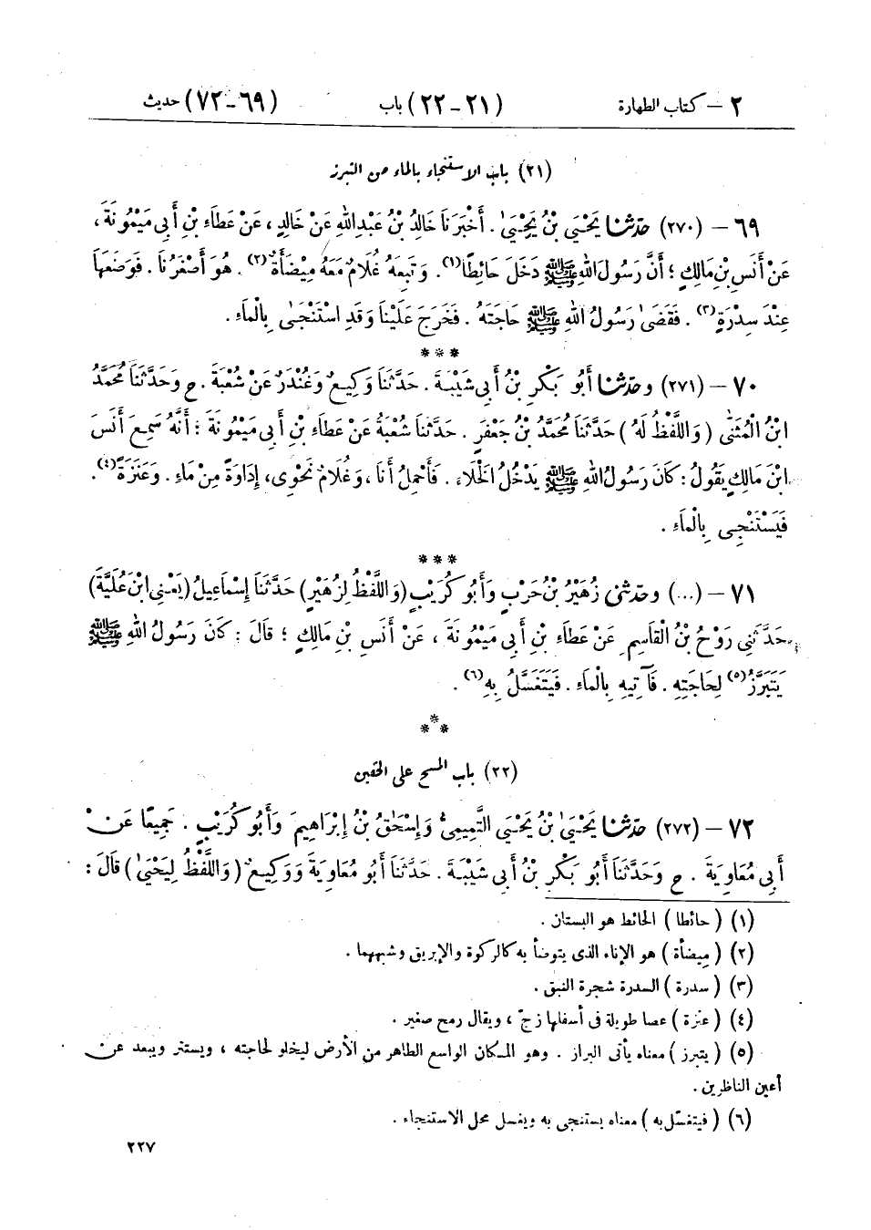 69 - (270) حَدَّثَنَا يَحْيَى بْنُ يَحْيَى، أَخْبَرَنَا خَالِدُ بْنُ عَبْدِ اللهِ، عَنْ خَالِدٍ، عَنْ عَطَاءِ بْنِ أَبِي مَيْمُونَةَ، عَنْ أَنَسِ بْنِ مَالِكٍ أَنَّ رَسُولَ اللهِ صَلَّى اللهُ عَلَيْهِ وَسَلَّمَ: «دَخَلَ حَائِطًا وَتَبِعَهُ غُلَامٌ مَعَهُ مِيضَأَةٌ، هُوَ أَصْغَرُنَا، فَوَضَعَهَا عِنْدَ سِدْرَةٍ، §فَقَضَى رَسُولُ اللهِ صلَّى اللهِ عليْهِ وسلَّمَ حَاجَتَهُ، فَخَرَجَ عَلَيْنَا وَقَدِ اسْتَنْجَى بِالْمَاءِ»