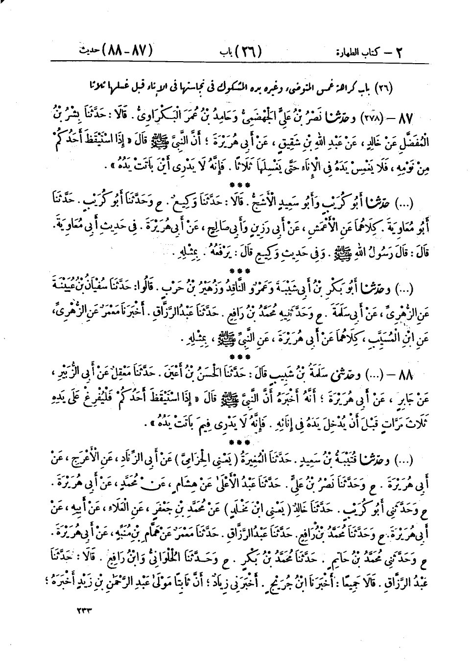 87 - (278) وَحَدَّثَنَا نَصْرُ بْنُ عَلِيٍّ الْجَهْضَمِيُّ، وَحَامِدُ بْنُ عُمَرَ الْبَكْرَاوِيُّ، قَالَا: حَدَّثَنَا بِشْرُ بْنُ الْمُفَضَّلِ، عَنْ خَالِدٍ، عَنْ عَبْدِ اللهِ بْنِ شَقِيقٍ، عَنْ أَبِي هُرَيْرَةَ، أَنَّ النَّبِيَّ صَلَّى اللهُ عَلَيْهِ وَسَلَّمَ قَالَ: «§إِذَا اسْتَيْقَظَ أَحَدُكُمْ مِنْ نَوْمِهِ، فَلَا يَغْمِسْ يَدَهُ فِي الْإِنَاءِ حَتَّى يَغْسِلَهَا ثَلَاثًا، فَإِنَّهُ لَا يَدْرِي أَيْنَ بَاتَتْ يَدُهُ».