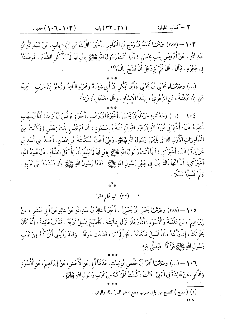 104 - (287) وَحَدَّثَنِيهِ حَرْمَلَةُ بْنُ يَحْيَى، أَخْبَرَنَا ابْنُ وَهْبٍ، أَخْبَرَنِي يُونُسُ بْنُ يَزِيدَ، أَنَّ ابْنَ شِهَابٍ، أَخْبَرَهُ قَالَ: أَخْبَرَنِي عُبَيْدُ اللهِ بْنُ عَبْدِ اللهِ بْنِ عُتْبَةَ بْنِ مَسْعُودٍ، أَنَّ أُمَّ قَيْسٍ بِنْتَ مِحْصَنٍ، - وَكَانَتْ مِنَ الْمُهَاجِرَاتِ الْأُوَلِ اللَّاتِي بَايَعْنَ رَسُولَ اللهِ صَلَّى اللهُ عَلَيْهِ وَسَلَّمَ وَهِيَ أُخْتُ عُكَّاشَةَ بْنِ مِحْصَنٍ أَحَدُ بَنِي أَسَدِ بْنِ خُزَيْمَةَ - قَالَ: أَخْبَرَتْنِي أَنَّهَا أَتَتْ رَسُولَ اللهِ صَلَّى اللهُ عَلَيْهِ وَسَلَّمَ بِابْنٍ لَهَا لَمْ يَبْلُغْ أَنْ يَأْكُلَ الطَّعَامَ قَالَ: عُبَيْدُ اللهِ أَخْبَرَتْنِي «أَنَّ ابْنَهَا ذَاكَ بَالَ فِي حَجْرِ رَسُولِ اللهِ صَلَّى اللهُ عَلَيْهِ وَسَلَّمَ، §فَدَعَا رَسُولُ اللهِ صَلَّى اللهُ عَلَيْهِ وَسَلَّمَ بِمَاءٍ فَنَضَحَهُ عَلَى ثَوْبِهِ وَلَمْ يَغْسِلْهُ غَسْلًا»