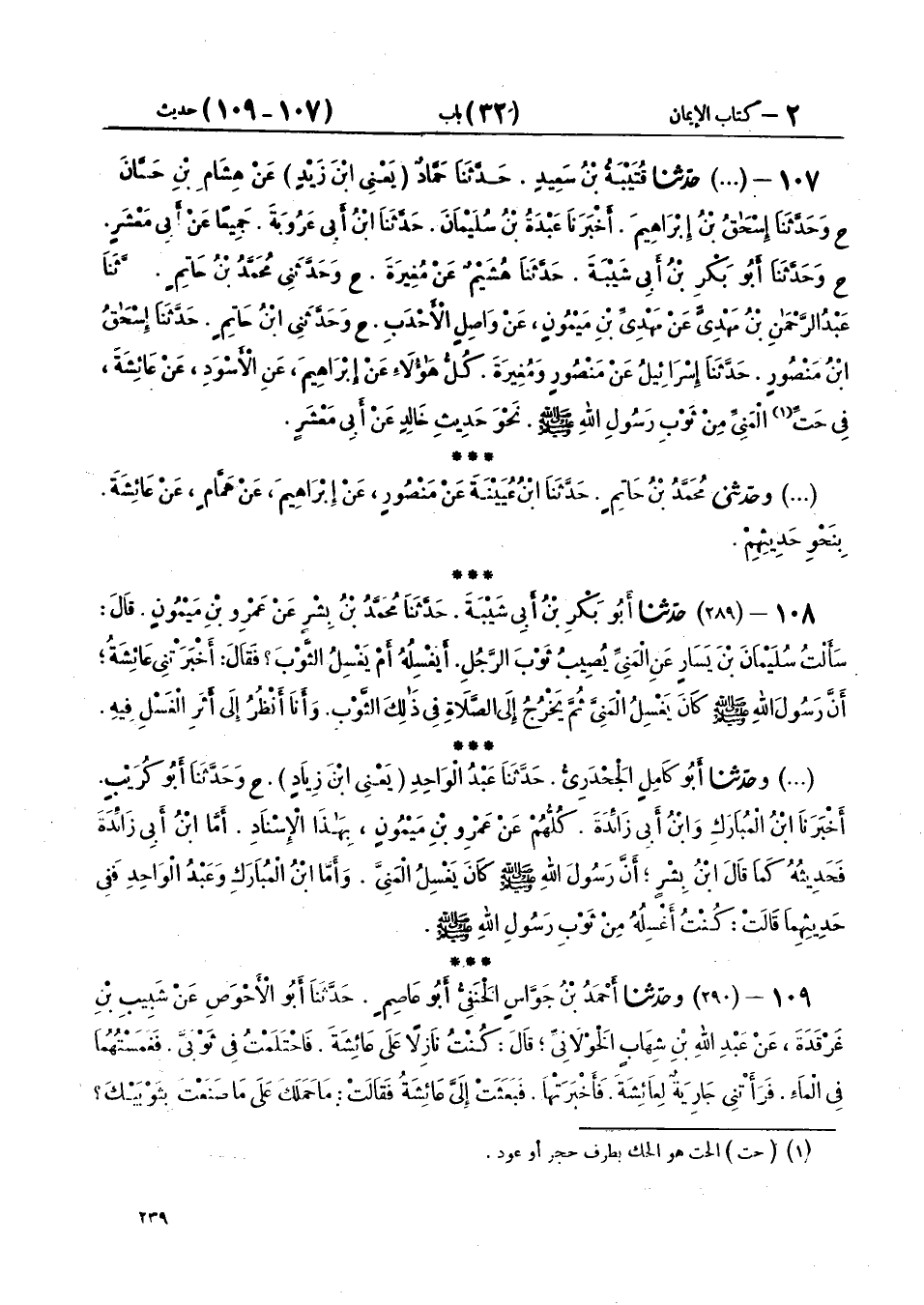 107 - (288) حَدَّثَنَا قُتَيْبَةُ بْنُ سَعِيدٍ، حَدَّثَنَا حَمَّادٌ يَعْنِي ابْنَ زَيْدٍ، عَنْ هِشَامِ بْنِ حَسَّانَ ح، وَحَدَّثَنَا إِسْحَاقُ بْنُ إِبْرَاهِيمَ، أَخْبَرَنَا عَبْدَةُ بْنُ سُلَيْمَانَ، حَدَّثَنَا ابْنُ أَبِي عَرُوبَةَ جَمِيعًا عَنْ أَبِي مَعْشَرٍ ح، وَحَدَّثَنَا أَبُو بَكْرِ بْنُ أَبِي شَيْبَةَ، حَدَّثَنَا هُشَيْمٌ، عَنْ مُغِيرَةَ، ح، وَحَدَّثَنِي مُحَمَّدُ بْنُ حَاتِمٍ، حَدَّثَنَا عَبْدُ الرَّحْمَنِ بْنُ مَهْدِيٍّ، عَنْ مَهْدِيِّ بْنِ مَيْمُونٍ، عَنْ وَاصِلٍ الْأَحْدَبِ، ح، وَحَدَّثَنِي ابْنُ حَاتِمٍ، حَدَّثَنَا إِسْحَاقُ بْنُ مَنْصُورٍ، حَدَّثَنَا إِسْرَائِيلُ، عَنْ مَنْصُورٍ، وَمُغِيرَةَ، كُلُّ هَؤُلَاءِ عَنْ إِبْرَاهِيمَ، عَنِ الْأَسْوَدِ، عَنْ عَائِشَةَ فِي حَتِّ الْمَنِيِّ مِنْ ثَوْبِ رَسُولِ اللهِ صَلَّى اللهُ عَلَيْهِ وَسَلَّمَ نَحْوَ حَدِيثِ خَالِدٍ، عَنْ أَبِي مَعْشَرٍ