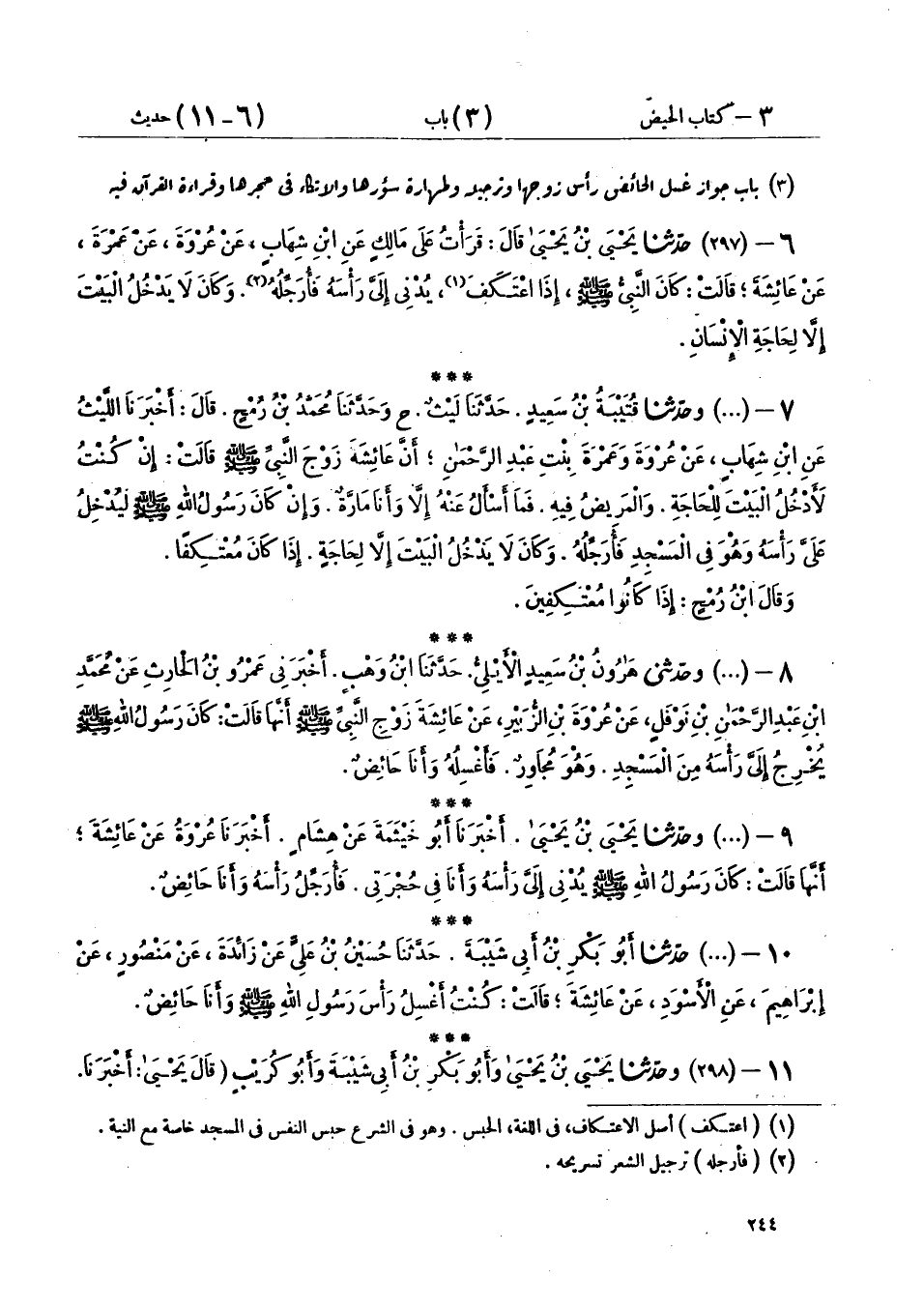 9 - (297) وَحَدَّثَنَا يَحْيَى بْنُ يَحْيَى، أَخْبَرَنَا أَبُو خَيْثَمَةَ، عَنْ هِشَامٍ، أَخْبَرَنَا عُرْوَةُ، عَنْ عَائِشَةَ أَنَّهَا قَالَتْ: «§كَانَ رَسُولُ اللهِ صَلَّى اللهُ عَلَيْهِ وَسَلَّمَ يُدْنِي إِلَيَّ رَأْسَهُ وَأَنَا فِي حُجْرَتِي، فَأُرَجِّلُ رَأْسَهُ وَأَنَا حَائِضٌ»